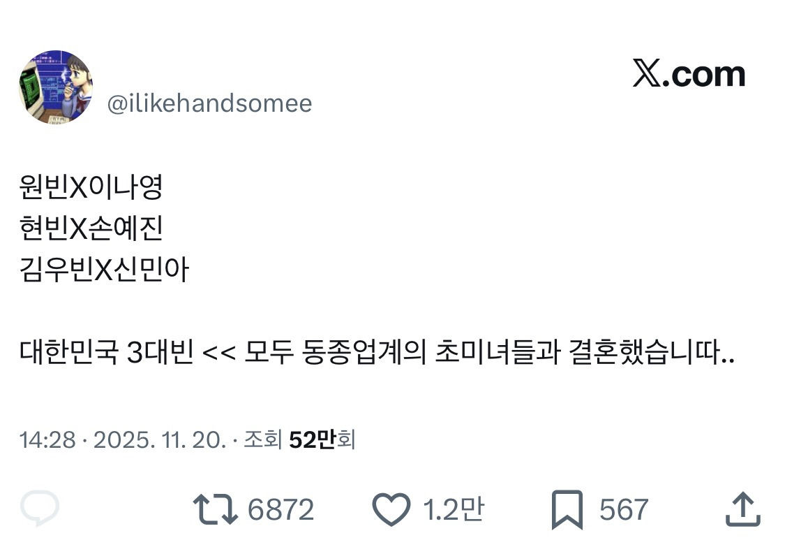 [스크랩] [흥미돋]대한민국 3대빈 << 모두 동종업계의 초미녀들과 결혼했습니다 작성자서현|작성시간26.03.13|조회수63,046 목록 댓글 37 글자크기 작게가 글자크기 크게가 출처: https://x.com/ilikehandsomee/status/1991377977368801569이나영 X 원빈손예진 X 현빈신민아 X 김우빈 다음검색 스크랩 원문 : *여성시대* 차분한 20대들의 알흠다운 공간 현재 게시글 추가 기능 열기 북마크 공유하기 신고 센터로 신고 댓글 댓글 37 댓글쓰기 답글쓰기 댓글 리스트 작성자일평생살빼기 | 작성시간 26.03.13 다 가짜빈 ㅎㅎ 작성자벌꿀오소리를건들면아주좆되는거야 | 작성시간 26.03.13 썩은 김우빈 빼 작성자쿠우쿠우화장실문지기 | 작성시간 26.03.14 셋다 결혼 너무 잘한거같아 작성자ㅈㅈㅈ진수맛궁금해허니 | 작성시간 26.03.14 김우빈이 저 중에 기부도 젤 마니하고 착할거야 껴줘 작성자브람팜팜 | 작성시간 26.03.14 김우빈은 왜 껴 나가 댓글 전체보기