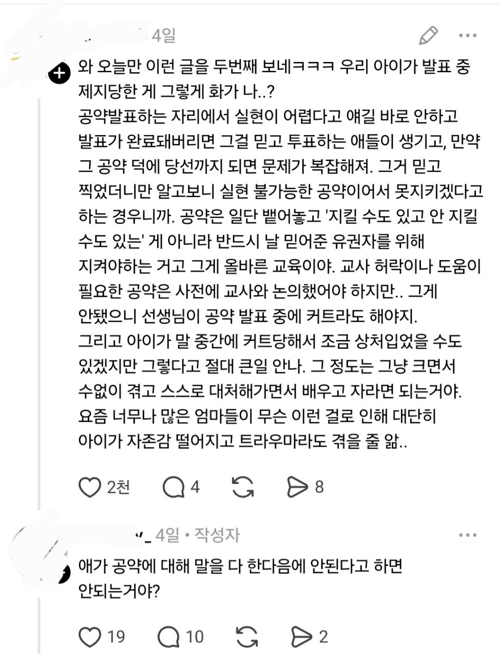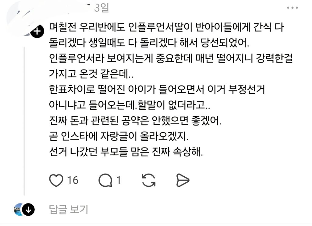 [칵.cxxx]우리 아이 공약 발표 때 선생님이 제지해서 화가 나 작성자귀여운덕수|작성시간26.03.13|조회수38,234 목록 댓글 53 글자크기 작게가 글자크기 크게가 출처: 여성시대 (본인 닉네임) 다음검색 현재 게시글 추가 기능 열기 북마크 공유하기 신고 센터로 신고 댓글 댓글 53 댓글쓰기 답글쓰기 댓글 리스트 작성자감각 | 작성시간 26.03.14 후드려패줘야해ㅡㅏㅁ 작성자7179 | 작성시간 26.03.14 자기가 준비한거라서... 본인이 망신당했다 생각하나.. 작성자공룡aㅅa | 작성시간 26.03.14 선거 학원도 있음 ^^ ㅋㅋㅋ 작성자구르꿘넯 | 작성시간 26.03.14 질린다 진짜 작성자Apvjela | 작성시간 26.03.14 씨바 인스타로교육해 그냥 학교왜보내노 댓글 전체보기