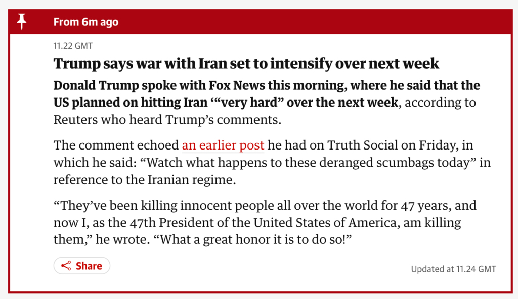 [가디언] 도널드 트럼프 미국 대통령은 13일 오전 폭스 뉴스와의 인터뷰에서 미국이 다음 주 중으로 이란을 "매우 강력하게(very hard)" 타격할 계획이라고 밝혔다.
