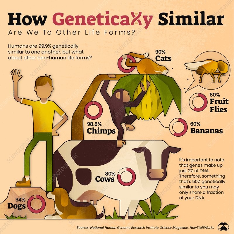 바나나와 초파리는 인간과 유전적으로 60% 유사하며, 산소 필요성과 같이 생명 유지에 필수적인 여러 가지 필수 요소를 공유하고 있습니다. 이러한 유사성은 유전학에 반영되어 있습니다.