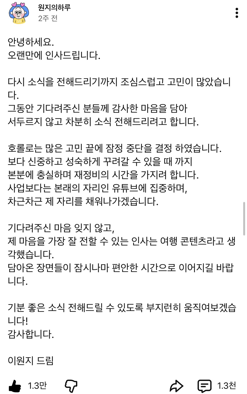 이제 본연의 여행 유튜버로서 집중한다고 하니