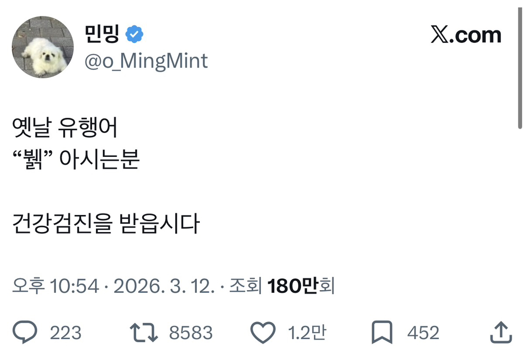 [흥미돋]옛날 유행어 “뷁” 아는사람 이글 봐 작성자보부상|작성시간26.03.14|조회수14,137 목록 댓글 53 글자크기 작게가 글자크기 크게가 출처: https://x.com/o_mingmint/status/2032092752851452077?s=46대장내시경 받으삼. 다음검색 현재 게시글 추가 기능 열기 북마크 공유하기 신고 센터로 신고 댓글 댓글 53 댓글쓰기 답글쓰기 댓글 리스트 작성자네모믜꿈 | 작성시간 26.03.14 뷁 작성자련나 좋아 | 작성시간 26.03.14 저는.. 아직 쓰는데요.. 이미지 확대 작성자캔유필마 할트비트코인? | 작성시간 26.03.14 아햏햏자 작성자잇몸조직재생연구자 | 작성시간 26.03.15 받음 ㅅㅂ ㅋㅋㅋㅋㅋ 작성자모여봐요 동물의숲 | 작성시간 26.03.15 ZIN렉사~~ 댓글 전체보기