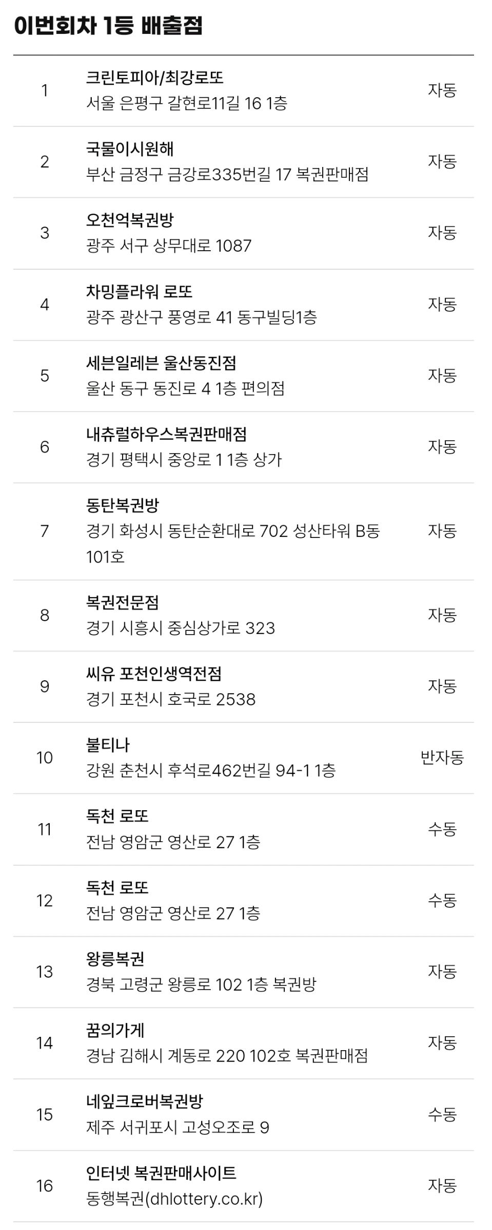 [흥미돋]오늘자 로또 1등 배출점 작성자Mia Goth|작성시간26.03.14|조회수54,216 목록 댓글 89 글자크기 작게가 글자크기 크게가 출처: 여성시대 Mia Goth+ 동행복권 2등도 2개 당첨! 다음검색 현재 게시글 추가 기능 열기 북마크 공유하기 신고 센터로 신고 댓글 댓글 89 댓글쓰기 답글쓰기 댓글 리스트 작성자큰일은 여자가 한다 | 작성시간 26.03.15 울산 !!!! 작성자마빡어택 | 작성시간 26.03.15 부천 뭐하냐 시바알 ㅠㅠ(부천 주민 아님 거기 들렀다 갑자기 샀음..) 작성자롤로노아조로 | 작성시간 26.03.15 아 1등 저기 걸어서 1분 거리에 있는 다른 복권방에서 샀는데 하... 작성자뛰라노사우르스 | 작성시간 26.03.15 나인터넷에서샀는데 나다… 작성자뉴에라에라 | 작성시간 26.03.15 와 댓글 전체보기