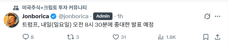 [기타]트럼프 8시간 후 중대발표 예정 작성자정동남|작성시간26.03.14|조회수62,742 목록 댓글 242 글자크기 작게가 글자크기 크게가 출처: https://x.com/jonborica/status/2032809601524191352?s=20 다음검색 현재 게시글 추가 기능 열기 북마크 공유하기 신고 센터로 신고 댓글 댓글 242 댓글쓰기 답글쓰기 댓글 리스트 작성자꾸르르꿍꿍 | 작성시간 26.03.15 자나 발표하고 자 작성자배고파정말로 | 작성시간 26.03.15 발표했아? 작성자파스타덕후 | 작성시간 26.03.15 했어?? 작성자돈을 내려주세요 | 작성시간 26.03.15 짜즐나 작성자저녁먹고바로씻기 | 작성시간 26.03.15 우리나라포함해서 몇개국 파병보내라는거였나? 댓글 전체보기