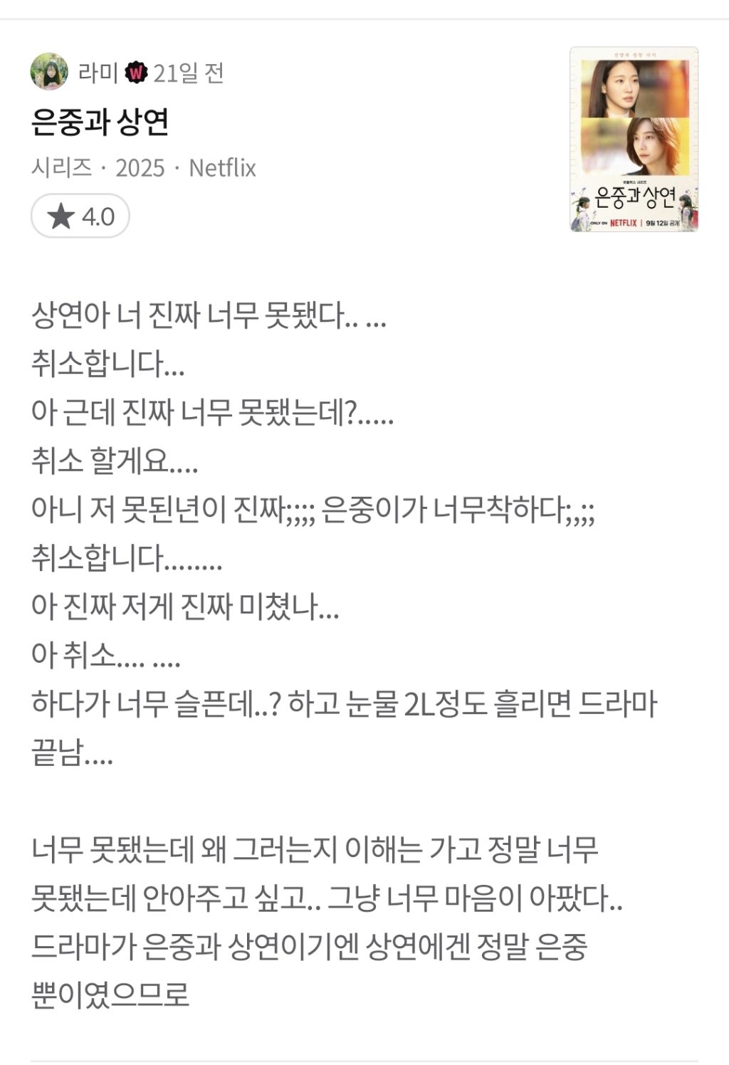 작성자막멩이 작성시간 26.03.15 끝까지 이해못함 너무 자기연민 심하고 자기만 불쌍하고