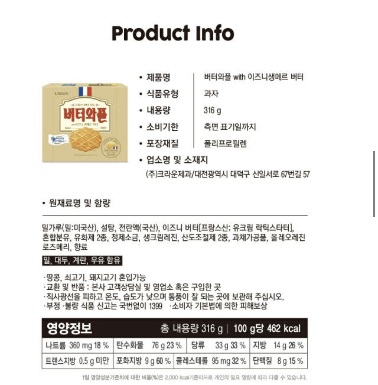 [스크랩] [흥미돋]크라운 과자 신상 이즈니생메르 버터와플, 두바이 스타일 쵸코하임 작성자Salt and Light|작성시간26.03.15|조회수13,080 목록 댓글 13 글자크기 작게가 글자크기 크게가 출처: 여성시대 바나나스플릿구슬https://m.brand.naver.com/crownmall/best크라운제과 공식몰 : 브랜드스토어크라운제과와 함께하는 달콤바삭한 인기간식 하임/쿠크다스/산도/버터와플 참크래커/콘칲brand.naver.com버터 퍼센트 추가~ 다음검색 스크랩 원문 : *여성시대* 차분한 20대들의 알흠다운 공간 현재 게시글 추가 기능 열기 북마크 공유하기 신고 센터로 신고 댓글 댓글 13 댓글쓰기 답글쓰기 댓글 리스트 작성자온실속대마cho | 작성시간 26.03.15 개맛잇겟다 작성자냥르장머리 | 작성시간 26.03.15 이미 먹어봄 킼 이미지 확대 작성자닉뭐하노 | 작성시간 26.03.15 초코하임 별로임버터와플 오리지널이 더 진하고 맛있음 이거 밍밍해... 작성자듀즈링 | 작성시간 26.03.15 과자치고 성분표 디게 깔끔한 느낌??? 답댓글 작성자헐레벌레 | 작성시간 26.03.24 마자 버터와플 성분 심플함. 버터도 항상 프랑스아니면 뉴질랜드?버터던데 뭐쓰는걸까 댓글 전체보기