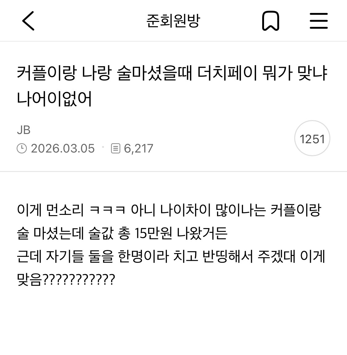작성자심해군주 쿠키 작성시간 26.03.16 ㄹㅇ 개남미새; 얼마나 거렁뱅이 남자를 만나면 본인 친한 동생한테 저렇게 굴어? 나한테 언니가 오빠가 할 커플 만나서 놀면 그 '오빠'가 술값 밥값 내주던데? 나잇값 좀 하고 살아 남미새야