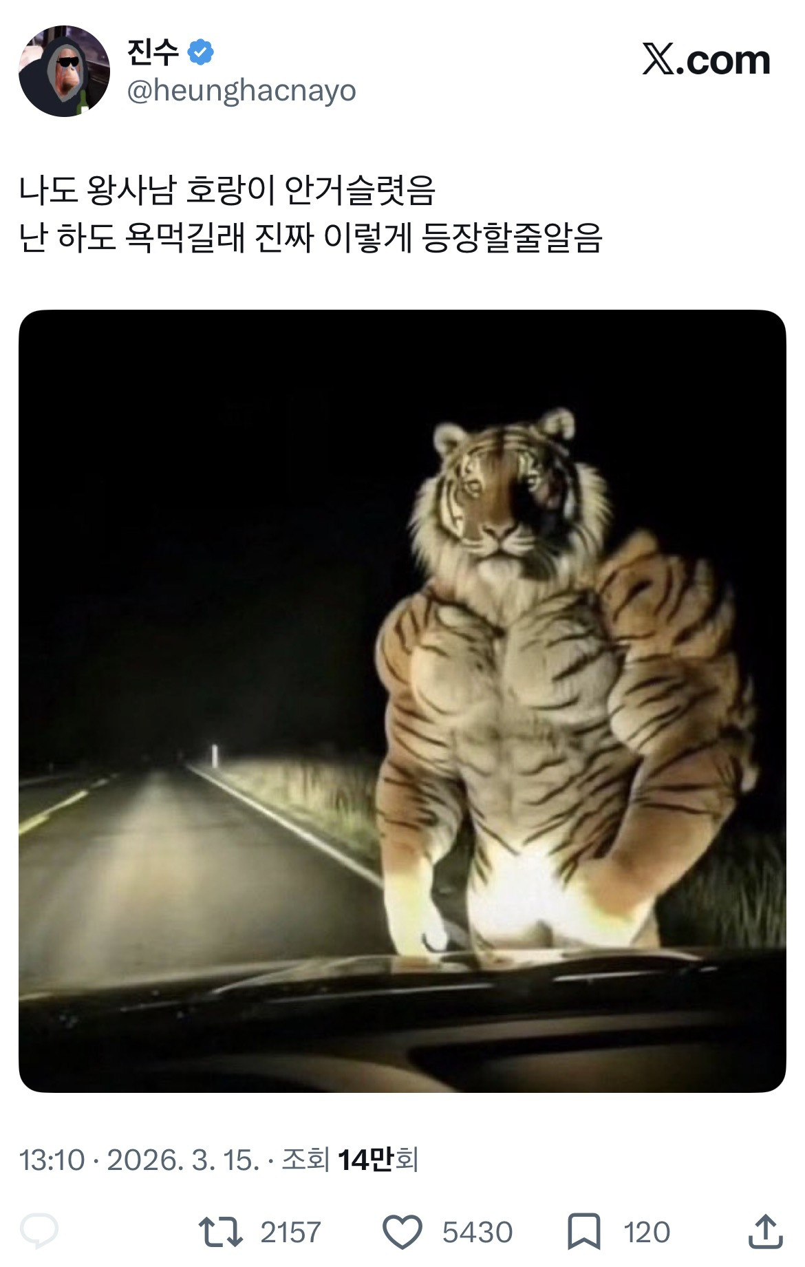 작성자구가지니 작성시간 26.03.15 이게 ㄹㅇ 천만안되고 걍 생각없이 보러갔을때 마주치는 호랑이와 하도 주변에서 호랑이 얘기할때 보는 호랑이는 느낌이 다르더라ㅋㅋㅋㅋ난 그전에 봤었기 때문에 호랑이 ㄹㅇ 짜쳐서 어이가없었음ㅋㅋㅋ