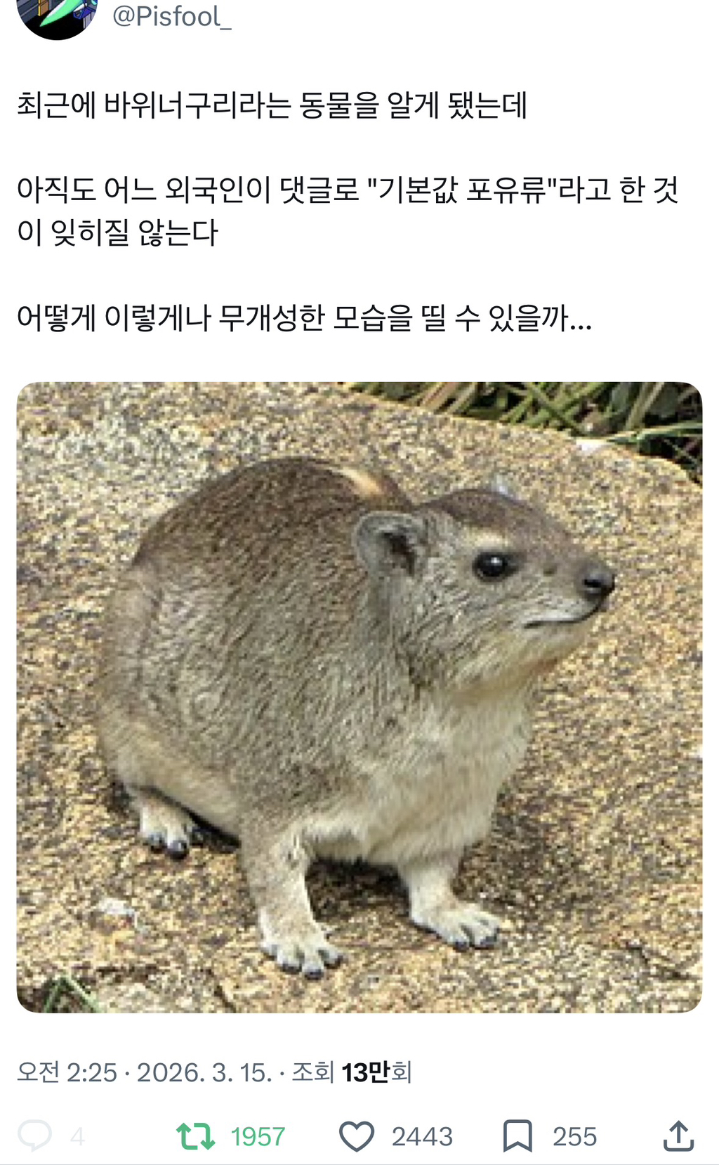 [흥미돋]“기본값 포유류” 작성자뿌치뿌치래빗|작성시간26.03.15|조회수19,320 목록 댓글 20 글자크기 작게가 글자크기 크게가 출처: https://x.com/pisfool_/status/2032870633319838039?s=46X의 Pisfool 빵떡나무님(@Pisfool_)최근에 바위너구리라는 동물을 알게 됐는데 아직도 어느 외국인이 댓글로 "기본값 포유류"라고 한 것이 잊히질 않는다 어떻게 이렇게나 무개성한 모습을 띨 수 있을까...x.com 다음검색 현재 게시글 추가 기능 열기 북마크 공유하기 신고 센터로 신고 댓글 댓글 20 댓글쓰기 답글쓰기 댓글 리스트 작성자칷 씨 | 작성시간 26.03.15 뚱즁 작성자햄멩이 | 작성시간 26.03.15 미소가 살짝 뭔가 음모를 꾸미는 듯 아닌듯 귀엽닼ㅋㅋㅋㅋㅋㅋ 작성자뾰로롱어른마녀 | 작성시간 26.03.15 와 진짜 이상적인 포유류다 ㅋㅋㅋㅋㅋㅋㅋㅋ귀엽지만이제 호락호락하진않은 표정 작성자귤상호 | 작성시간 26.03.16 ㄱㅇㅇ ㅠㅠㅠ 작성자요키는사랑 | 작성시간 26.03.16 귀엽다 댓글 전체보기