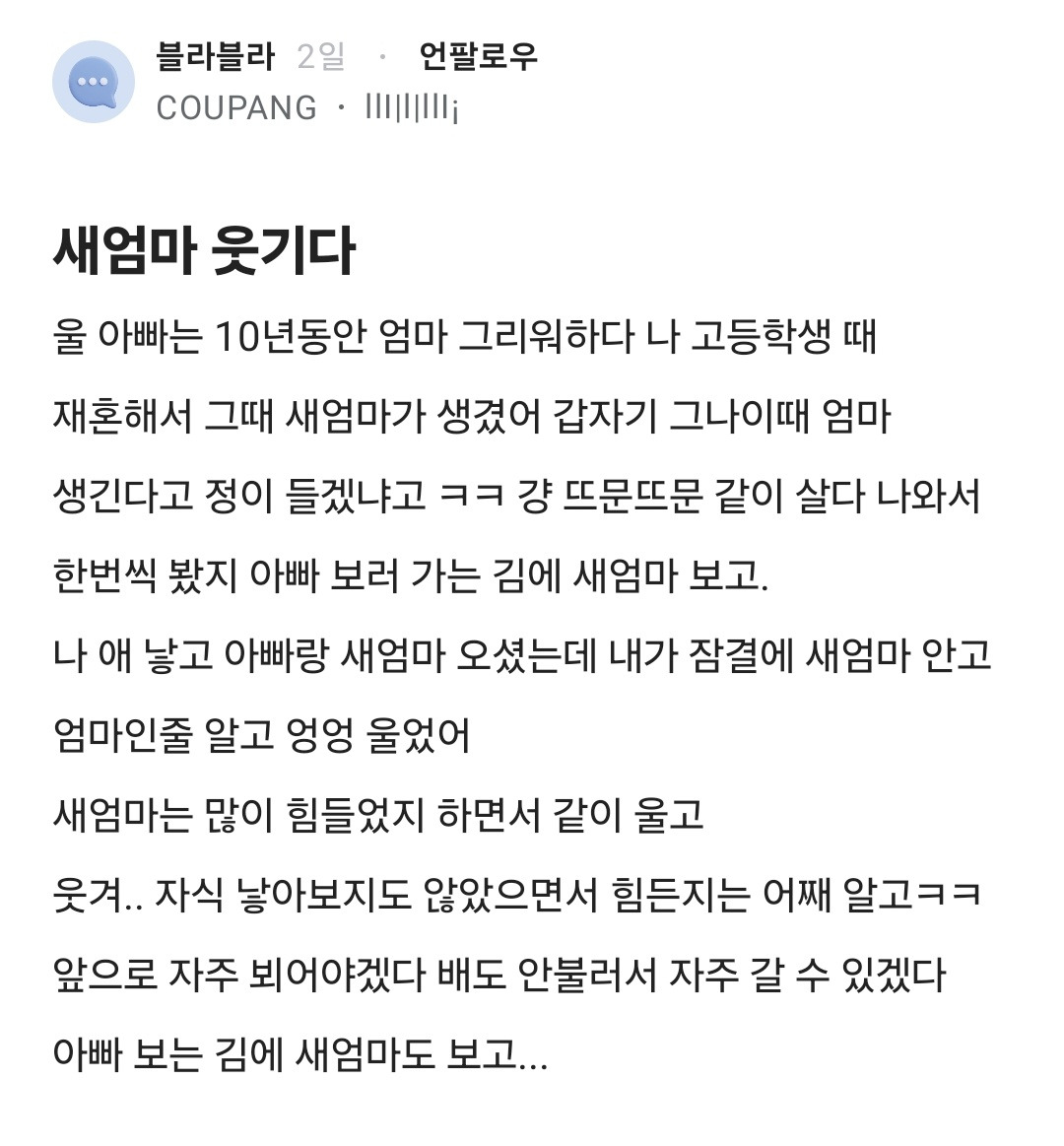 [흥미돋]새엄마 웃기다 작성자치스스틱|작성시간26.03.15|조회수100,167 목록 댓글 79 글자크기 작게가 글자크기 크게가 출처: https://x.com/stone0tak/status/2033054354291437883?s=46X의 돈마니반메훔님(@stone0tak)새엄마 웃기다 울 아빠는 10년동안 엄마 그리워하다 나 고등학생 때 재혼해서 그때 새엄마가 생겼어 갑자기 그나이때 엄마 생긴다고 정이 들겠냐고 ㅋㅋ 걍 뜨문뜨문 같이 살다 나와서 한번씩 x.com 다음검색 현재 게시글 추가 기능 열기 북마크 공유하기 신고 센터로 신고 댓글 댓글 79 댓글쓰기 답글쓰기 댓글 리스트 작성자언니 나 사랑하는 개가 생겼어 | 작성시간 26.03.15 웃긴거라며..ㅠㅠ 작성자헛소리 금지 | 작성시간 26.03.15 작성자이랴이랴 | 작성시간 26.03.15 하씨..자야되는데 울어버렸네ㅠㅠㅠ행복하세요 작성자이세상모든댕댕이가행복하게해주세요 | 작성시간 26.03.16 눙물.. 작성자단발머리소녀 | 작성시간 26.03.20 아빠보러가는 김에 새엄마도 보고.. 아빠보러가는 김에 새엄마고 보고... 댓글 전체보기
