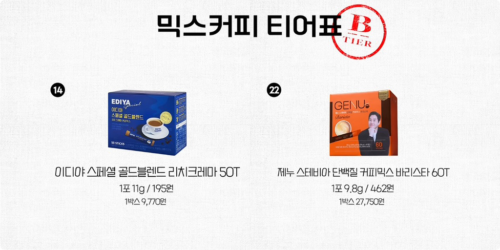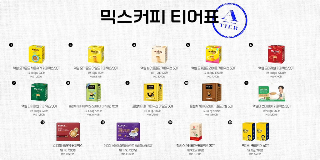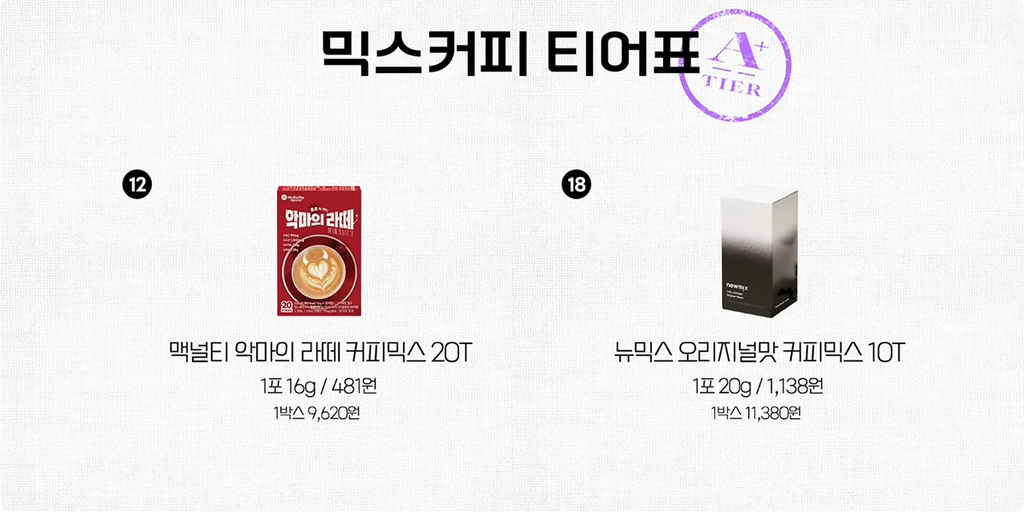 [흥미돋]커피 유튜버가 정해본 믹스커피 티어표 작성자오징어티김|작성시간26.03.15|조회수14,653 목록 댓글 71 글자크기 작게가 글자크기 크게가 출처: https://theqoo.net/square/4127181876진리의 둘둘둘둘둘둘 모르는 사람이 있길래 추가 ㅠㅠ 가성비 1등은 맥골&화골개성 있는걸 느껴보고 싶다 A+~S 다음검색 현재 게시글 추가 기능 열기 북마크 공유하기 신고 센터로 신고 댓글 댓글 71 댓글쓰기 답글쓰기 댓글 리스트 작성자버거리 클래식치즈버거 | 작성시간 26.03.16 슈골 맛나요 작성자와이번쓱 | 작성시간 26.03.16 슈프림골드 맛잇더라 작성자ㅋㅋㅋㅋㅋㅋㅋㅋㅎ | 작성시간 26.03.16 슈프림골드 중독임 작성자쌀국수중독됨 | 작성시간 26.03.16 카누가왜없지..? 작성자그렇개됐다 | 작성시간 26.03.16 슈골 존맛...우유에 슈골 2개 타서 얼음 넣어서 먹으면 진짜 맛있음... 댓글 전체보기
