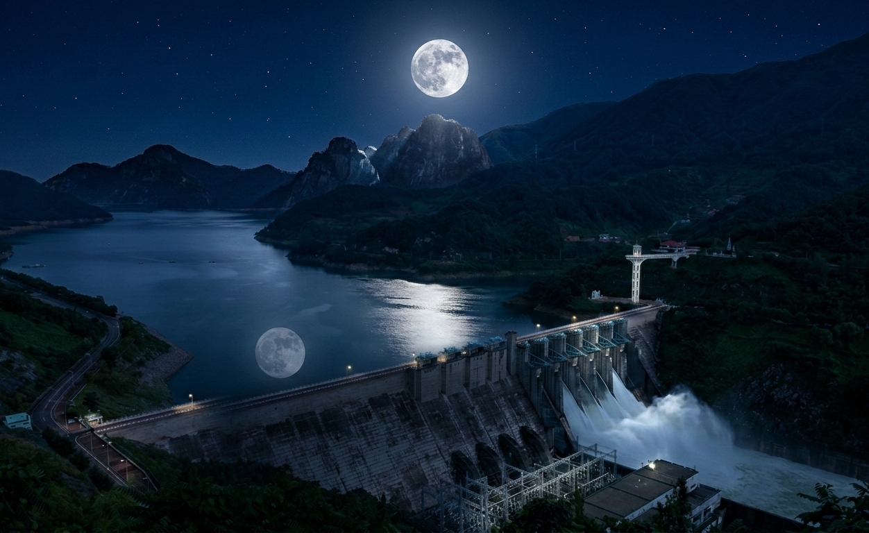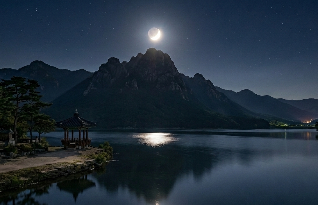물이 가득찬 수면 위로 달빛이 비치며,