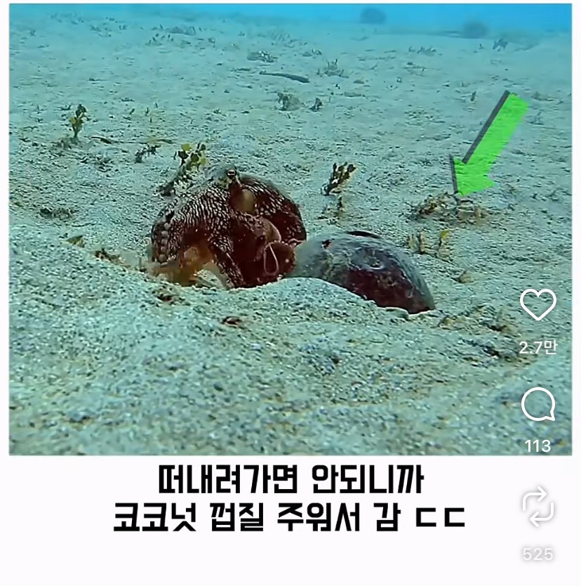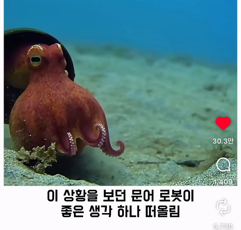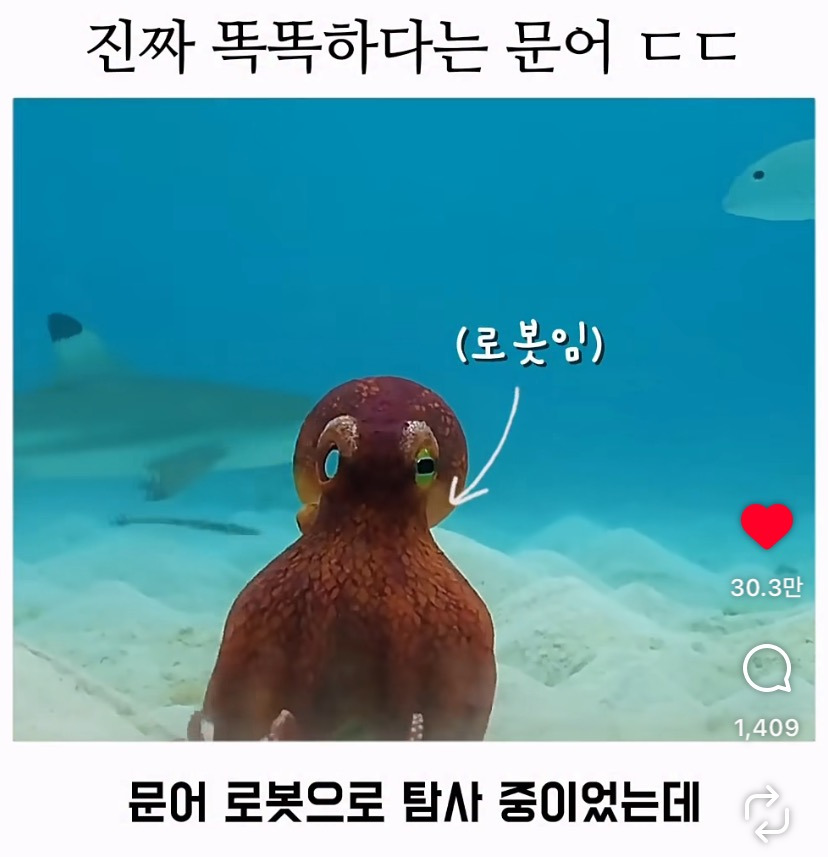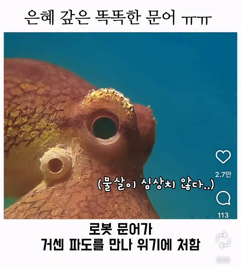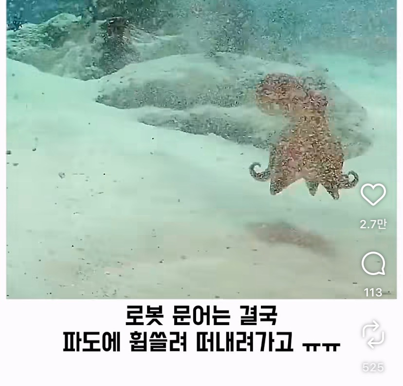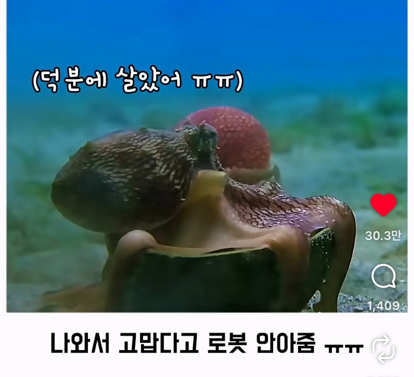 저이후에 찐문어가 로봇문어 조류에 휩쓸리려는거 잡아주기도 하고 친구로 생각하고 계속 데리고다녔다고함ㅋㅋㅋㅋㅋ
