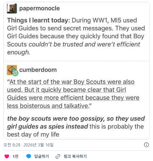 [흥미돋]영국이 보이 스카우트를 스파이로 캐스팅하지 못한 이유 작성자귤토끼이|작성시간26.03.17|조회수14,435 목록 댓글 5 글자크기 작게가 글자크기 크게가 출처: https://www.dmitory.com/issue/403937545 https://x.com/i/status/2033324542496493661 다음검색 현재 게시글 추가 기능 열기 북마크 공유하기 신고 센터로 신고 댓글 댓글 5 댓글쓰기 답글쓰기 댓글 리스트 작성자nfowbak | 작성시간 26.03.17 남자 설명 그자체 작성자진짜공부한다햇다 | 작성시간 26.03.17 남자들이그렇지뭐 작성자Day n Nite | 작성시간 26.03.17 아 진짜 입 가벼운 거 종특이구나 작성자검은고양이15 | 작성시간 26.03.17 남자 작성자Mi piacciono i gatti | 작성시간 26.03.17 이래놓고 여자들보고 말많다 입 가볍다 ㅇㅈㄹ 댓글 전체보기