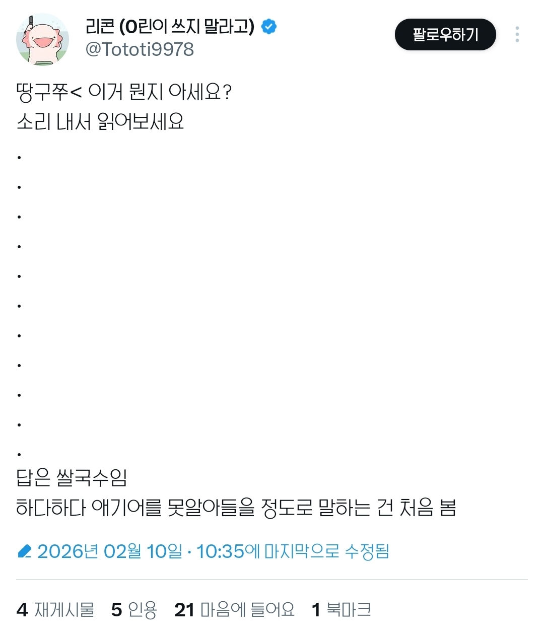 [스크랩] [흥미돋]땅구쭈< 이거 뭔지 아세요? 작성자flflf|작성시간26.03.17|조회수28,932 목록 댓글 74 글자크기 작게가 글자크기 크게가 출처: https://x.com/i/status/2021035249636179989https://x.com/i/status/2021035249636179989유튜브 쇼츠에서 봤다함;; 다음검색 스크랩 원문 : *여성시대* 차분한 20대들의 알흠다운 공간 현재 게시글 추가 기능 열기 북마크 공유하기 신고 센터로 신고 댓글 댓글 74 댓글쓰기 답글쓰기 댓글 리스트 작성자얼떨결에 100억? | 작성시간 26.03.17 뭐래 시발 작성자쥐눈이콩볶음 | 작성시간 26.03.17 굽주 언니 말하는 줄 작성자08:20 | 작성시간 26.03.17 여자가오... 작성자선플달기운동본부 | 작성시간 26.03.17 작성자ffffubao | 작성시간 26.03.18 아 꺼져 댓글 전체보기