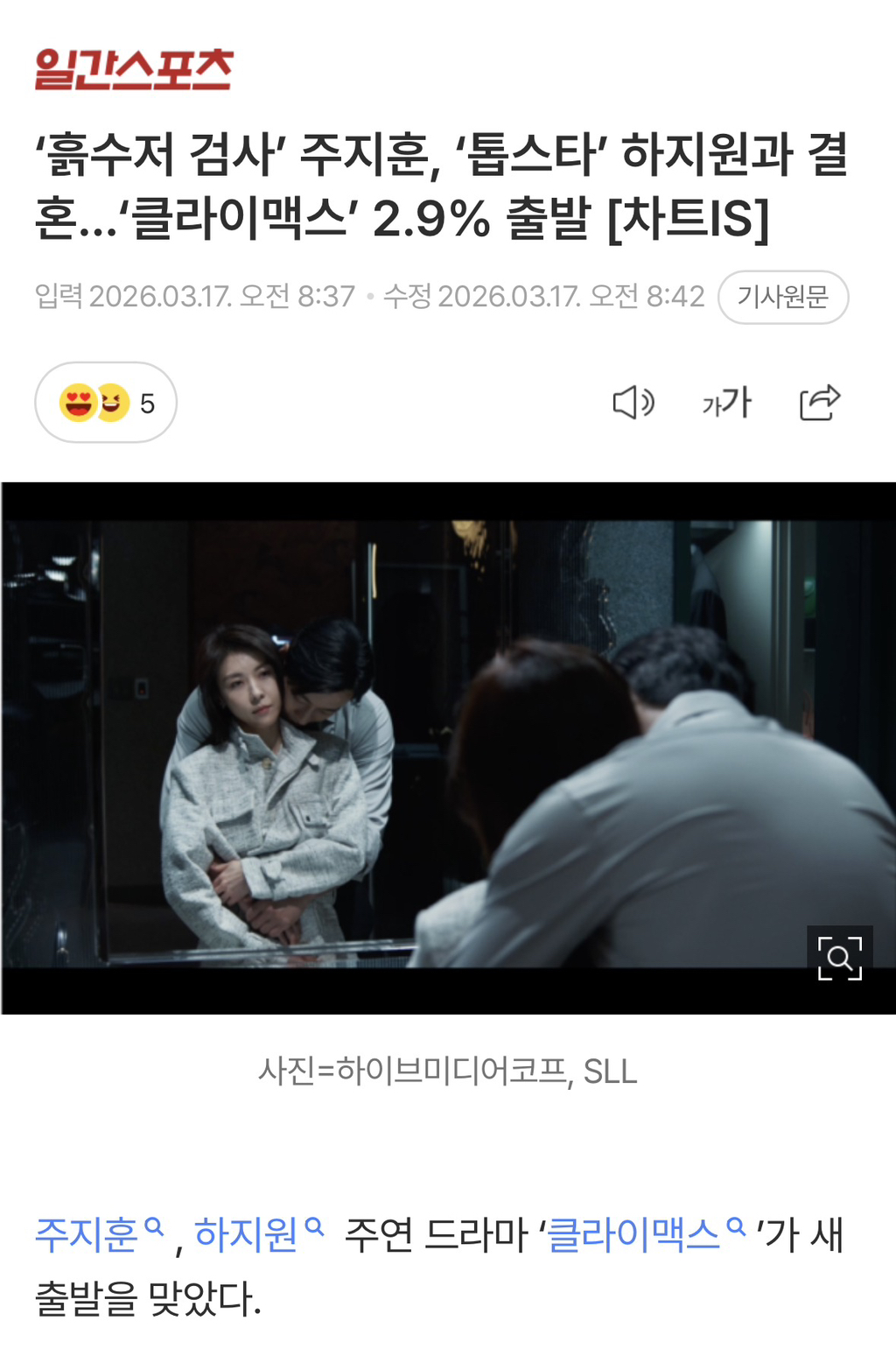 [여시뉴스데스크]‘흙수저 검사’ 주지훈, ‘톱스타’ 하지원과 결혼…‘클라이맥스’ 2.9% 출발 작성자folklore|작성시간26.03.17|조회수9,276 목록 댓글 14 글자크기 작게가 글자크기 크게가 출처: 여성시대 (folklore)https://m.entertain.naver.com/home/article/241/0003499629‘흙수저 검사’ 주지훈, ‘톱스타’ 하지원과 결혼…‘클라이맥스’ 2.9% 출발 [차트IS]여기를 눌러 링크를 확인하세요m.entertain.naver.com하지원 4년만의 복귀작아직 안봤는데 평이 좋음 다음검색 현재 게시글 추가 기능 열기 북마크 공유하기 신고 센터로 신고 댓글 댓글 14 댓글쓰기 답글쓰기 댓글 리스트 작성자Siri.. | 작성시간 26.03.17 개존잼이더라 엔딩 휘파람 개소름;;;;오랜만에 드라마 챙겨볼듯 작성자cjehfjriwp | 작성시간 26.03.17 존잼이더라 작성자시간은 고요히 흐르고 | 작성시간 26.03.17 하지원 때문에 채널 돌렸다가 차주영 진짜진짜 연기 잘하더라!!!! 작성자ㅈㅈㅈ진수맛궁금해허니 | 작성시간 26.03.17 오 디플에 잇네 작성자메로나a | 작성시간 26.03.17 ott엔없다니 ㅜ 댓글 전체보기