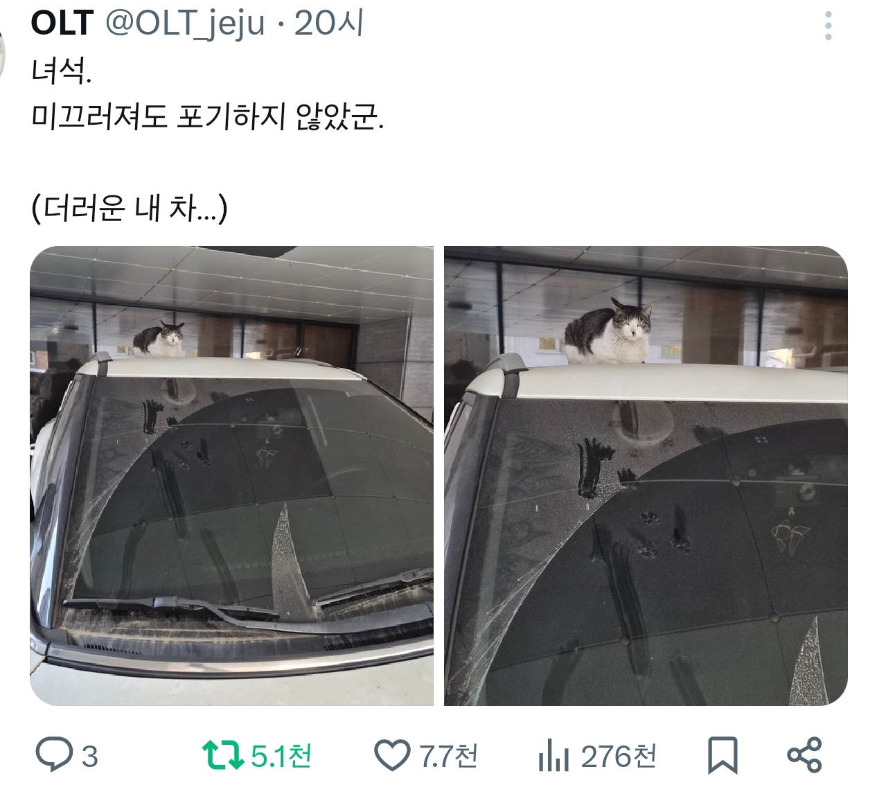 [흥미돋]녀석 미끄러져도 포기하지 않았군 작성자너너뉘기야|작성시간26.03.17|조회수12,505 목록 댓글 12 글자크기 작게가 글자크기 크게가 출처: https://x.com/i/status/2033480494868992102X의 OLT님(@OLT_jeju)녀석. 미끄러져도 포기하지 않았군. (더러운 내 차...)x.comㄱㅇㅇ ㅋㅋㅋㅋㅋㅋㅋㅋㅋㅋㅋㅋㅋㅋㅋㅋ 다음검색 현재 게시글 추가 기능 열기 북마크 공유하기 신고 센터로 신고 댓글 댓글 12 댓글쓰기 답글쓰기 댓글 리스트 작성자소화불량자 | 작성시간 26.03.17 ㄱㅇㅇ 작성자싫어~~~ | 작성시간 26.03.17 나도 예전에 내 차 뒤에 발자국 찍혀잇어서 입에 주먹넣고 사진찍음 ㅠ 개기여움 이미지 확대 답댓글 작성자감각 | 작성시간 26.03.17 ㄱㅇㅇㅇㅇㅇㅇㅇㅇㅇ❤️❤️❤️❤️ 답댓글 작성자한다면하는상여자 | 작성시간 26.03.18 ㅈㄴ귀야워진짜 ㅠㅠ 작성자한다면하는상여자 | 작성시간 26.03.18 ㅋㅋㅋㅋㅋㅋㅋㅋ너무귀엽닼ㅋㅋㅋㅋㅋㅋㅋㅋ ㅠㅠㅠㅠ 댓글 전체보기