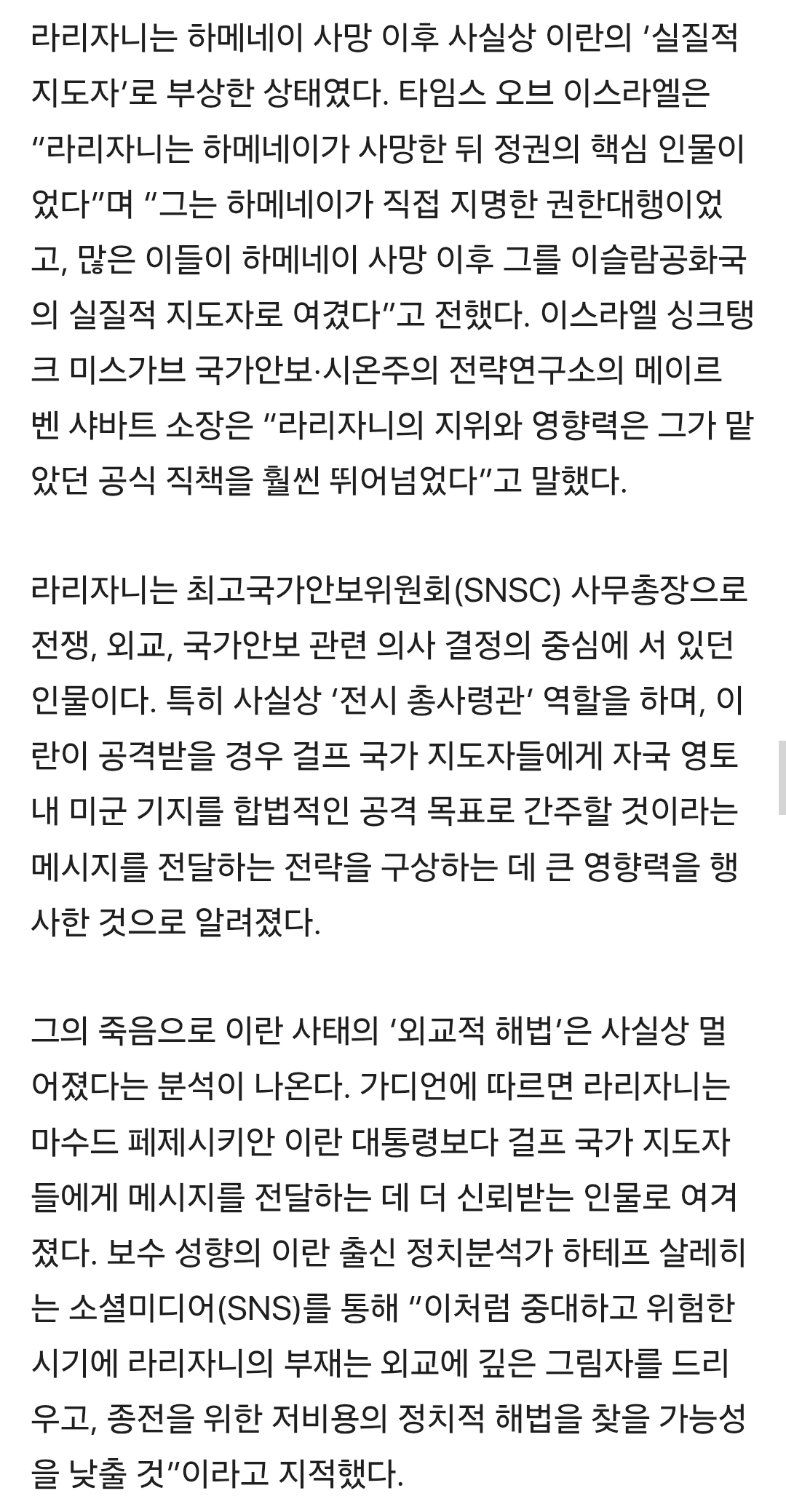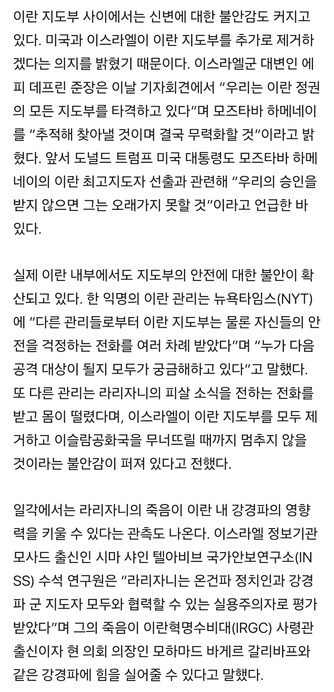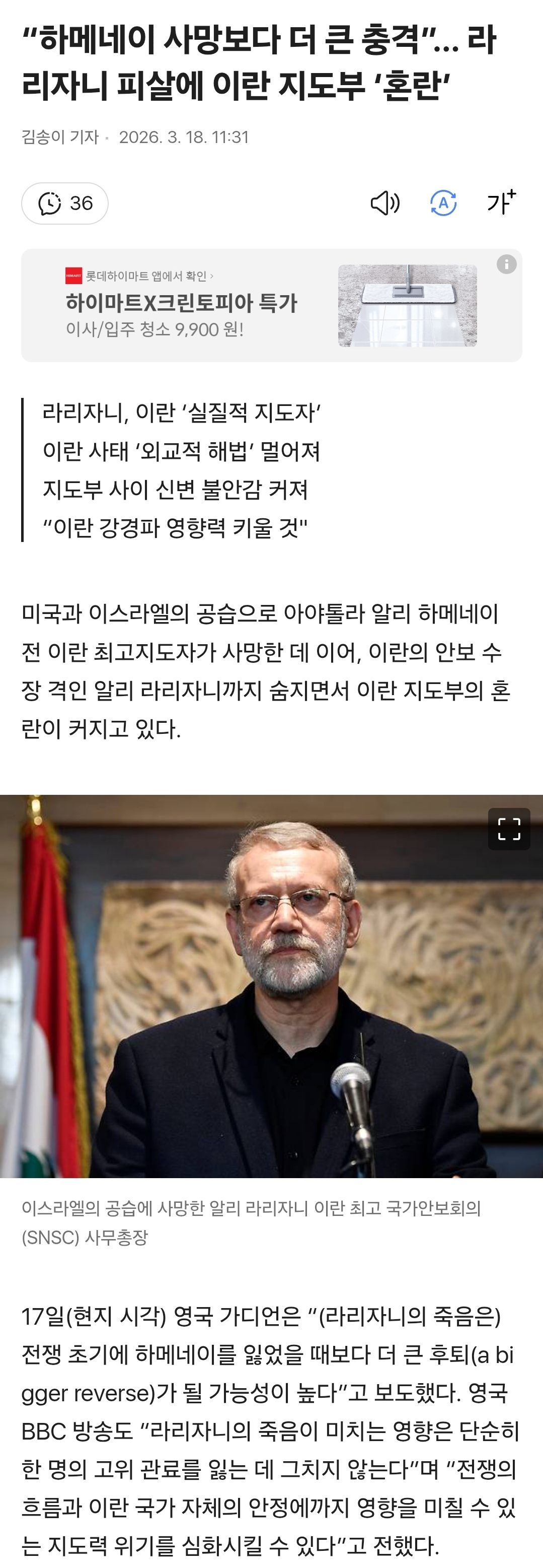 [여시뉴스데스크]“하메네이 사망보다 더 큰 충격”… 라리자니 피살에 이란 지도부 ‘혼란’ 작성자검동이|작성시간26.03.18|조회수5,576 목록 댓글 4 글자크기 작게가 글자크기 크게가 출처: https://v.daum.net/v/20260318113144892 ... 전문은 출처로.. 다음검색 현재 게시글 추가 기능 열기 북마크 공유하기 신고 센터로 신고 댓글 댓글 4 댓글쓰기 답글쓰기 댓글 리스트 작성자오리짐 | 작성시간 26.03.18 저렇게 하면 더 평화적으로 협의하기 어려워 진다는데... 작성자냥냥냥컴온 | 작성시간 26.03.18 무섭다.. ㅠㅠ 작성자런닝맨명탐정 | 작성시간 26.03.18 이스라엘 미친놈들 작성자08:20 | 작성시간 26.03.18 아 도른놈들진짜 댓글 전체보기