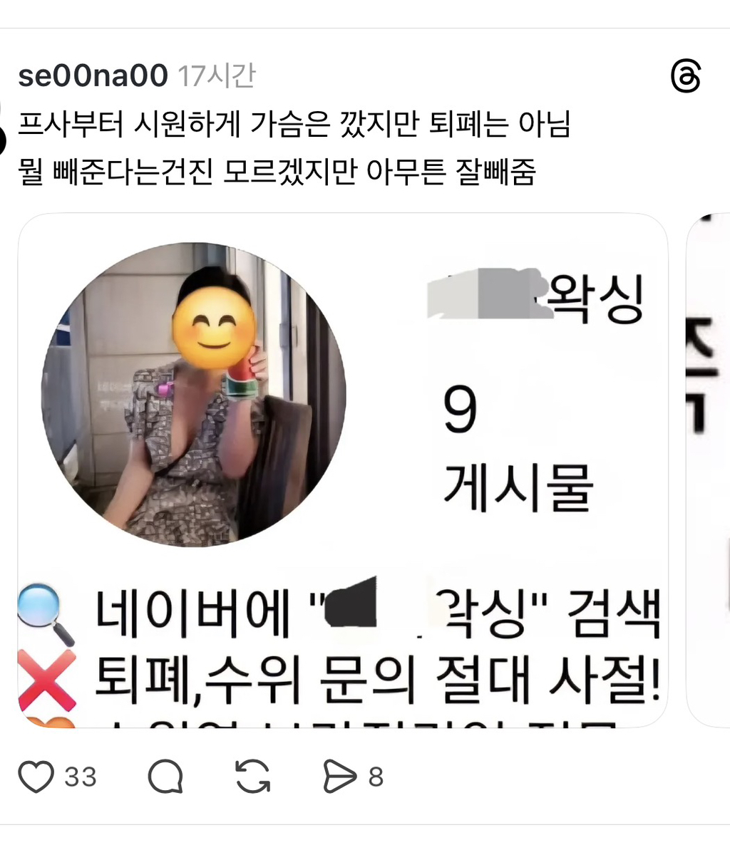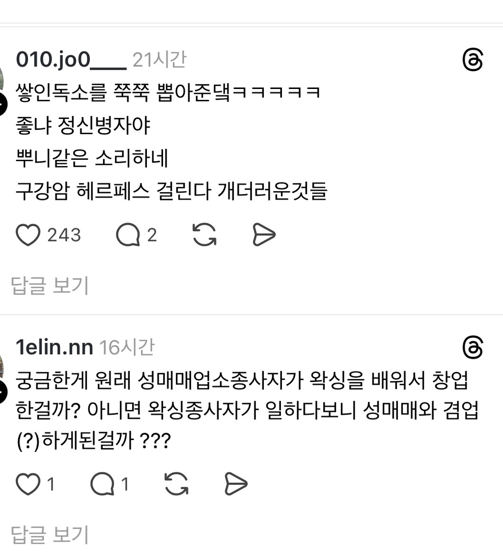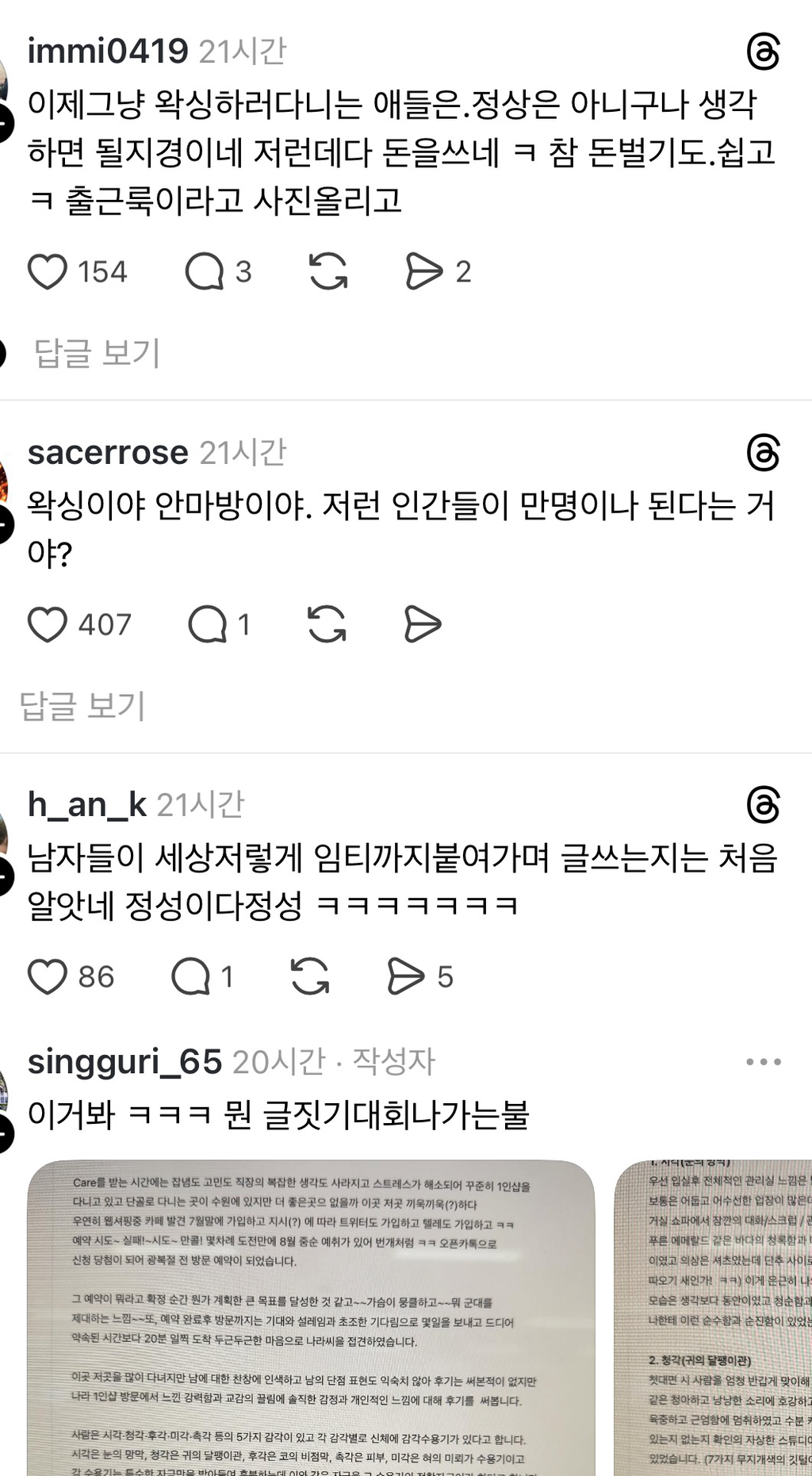[칵.cxxx]한국 남성분들이 가장 정성스레 후기쓰는 분야는?❤️ 작성자아기간장치킨|작성시간26.03.18|조회수7,011 목록 댓글 24 글자크기 작게가 글자크기 크게가 https://www.threads.com/@singguri_65/post/DV-ZFvjE2lQThreads의 박아라(@singguri_65)님와 며칠 전 밸리 왁싱 이후에 뿌니왁싱 네이버카페 후기보는데 ㅋㅋㅋㅋㅋ 진짜 개 쓰레기들만 모아놨나벼 왁싱받으러가는데 사장 의상 얼굴 좋아죽겠다는 것들ㅋㅋㅋㅋ 와 ㅋㅋㅋㅋ 대단하다www.threads.com 다음검색 현재 게시글 추가 기능 열기 북마크 공유하기 신고 센터로 신고 댓글 댓글 24 댓글쓰기 답글쓰기 댓글 리스트 작성자호외요를레히 | 작성시간 26.03.18 100% 수기=손100% 진심=가슴이거 맞지? 답댓글 작성자HARARA | 작성시간 26.03.18 헐 작성자stay in the middle | 작성시간 26.03.18 삽입은 안하는데인가?? 저 한 사람 혼자 만명? 징그럽다 시벨 비위도 좋아 작성자도룡뇽파 | 작성시간 26.03.19 씨빌 역겨워 작성자네모네모스판지밥 | 작성시간 26.03.27 더러워 ㅅㅂ 댓글 전체보기
