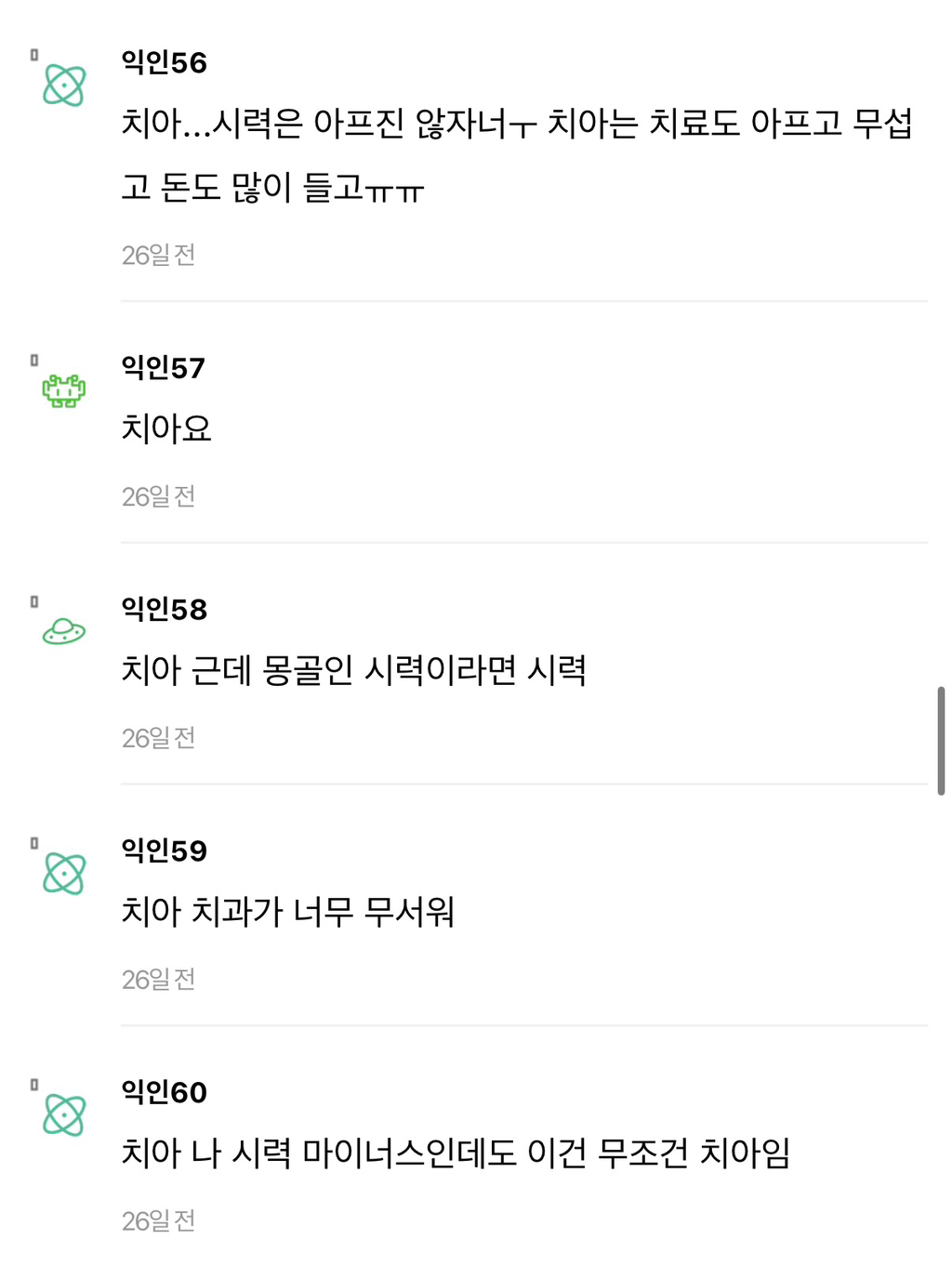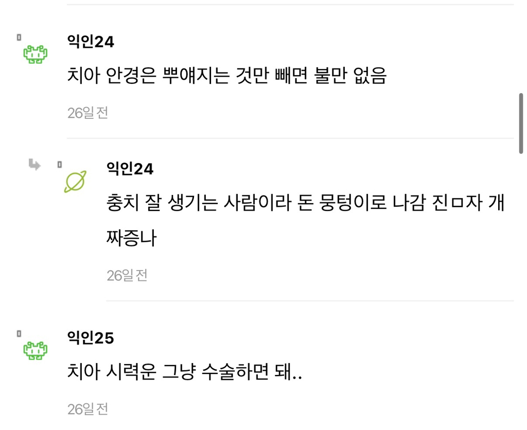 [흥미돋]새걸로 바꿔낄수있다면 시력vs치아.jpg 작성자모낙카|작성시간26.03.18|조회수26,699 목록 댓글 420 글자크기 작게가 글자크기 크게가 출처: 여성시대 모낙카장문댓만 퍼왔는데 치아가 많은편 다음검색 현재 게시글 추가 기능 열기 북마크 공유하기 신고 센터로 신고 댓글 댓글 420 댓글쓰기 답글쓰기 댓글 리스트 작성자파바곰 | 작성시간 26.03.20 치아 안좋아서 ㅜ 작성자설윤(NMIXX) | 작성시간 26.03.20 치아 제발 작성자행운의도토리 | 작성시간 26.03.20 치아요 제발 작성자콜라가 부족해 | 작성시간 26.03.21 닥 치아.. 시력은 안좋아도 안경으로 커버 가능하잖아 ㅠ 라식도 있고.. 치아는 싹 다 임플란트할수도 없는 노릇 작성자지독한얼빠 | 작성시간 26.03.25 나는....치아 튼튼해서 시력 댓글 전체보기