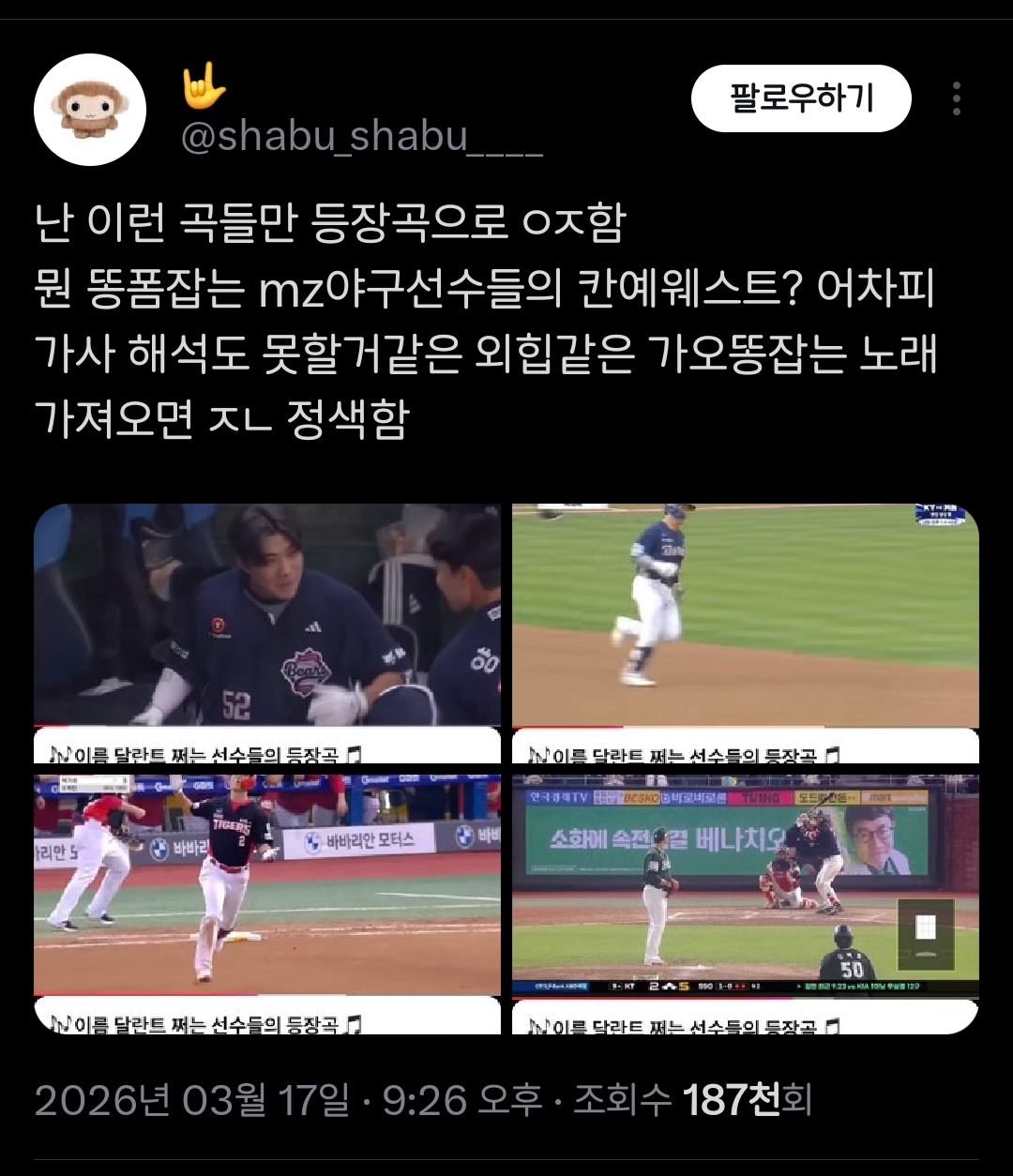 [흥미돋][KBO] 난 이런 곡들만 등장곡으로 ㅇㅈ함.twt 작성자(본인 닉네임),|작성시간26.03.18|조회수8,895 목록 댓글 43 글자크기 작게가 글자크기 크게가 출처: https://x.com/i/status/2033882641481847271X의 🤟님(@shabu_shabu____)난 이런 곡들만 등장곡으로 ㅇㅈ함 뭔 똥폼잡는 mz야구선수들의 칸예웨스트? 어차피 가사 해석도 못할거같은 외힙같은 가오똥잡는 노래 가져오면 ㅈㄴ 정색함x.com 다음검색 현재 게시글 추가 기능 열기 북마크 공유하기 신고 센터로 신고 댓글 댓글 43 댓글쓰기 답글쓰기 댓글 리스트 작성자멀쩡한닉네임 | 작성시간 26.03.19 최원태도 원ㅌ~~태!! 이거잖앝ㅋㅋ 작성자점멸 | 작성시간 26.03.19 외힙은 진짜 꼴갑임ㄹㅇㅋㅋㅋㅋㅋㅋㅋㅋㅋㅋㅋㅋㅋㅋㅋㅋㅋㅋㅋㅋㅋㅋㅋㅋㅋㅋㅋㅋㅋ 작성자박문댕 | 작성시간 26.03.19 한태양 좋은말할때 라이징썬써라 작성자소금빵버터많이 | 작성시간 26.03.19 진짜 팝송나오면 개 갑분싸됨 ㅋㅋㅋ 작성자싸왓디카 | 작성시간 26.03.20 아 최원태랑 김민 개웃기닼ㅋㅋㅋㅋ 댓글 전체보기