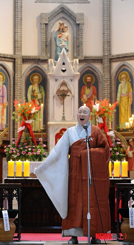 2012년 5월에 명동대성당에서 소프라노 정율 스님이 노래했다. 5월은 천주교에서는 성모 성월이고, 불교에서는 부처님 오신 날이 있는 달이다. 노래 제목은 ‘Ave maria’와 찬불가 ‘향심’. 교중 미사 특송으로 불렀다. 명동대성당에서 스님이 노래한 건 처음이었다. 신자들은 열화와 같은 박수로 환호했다.