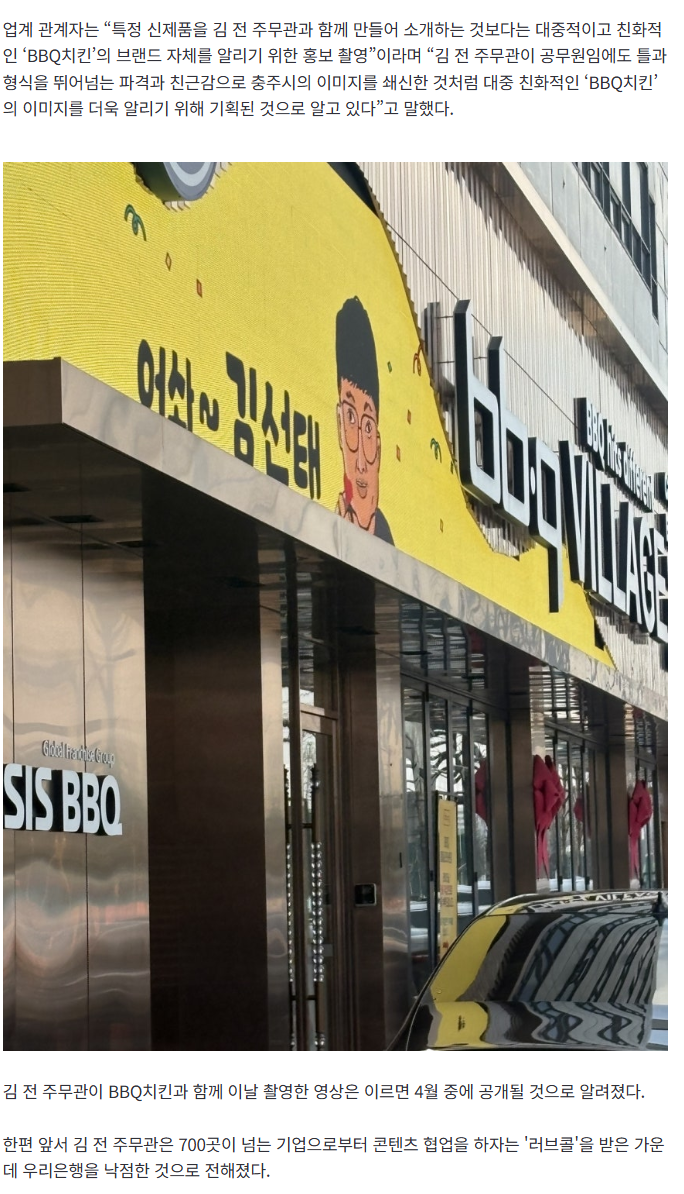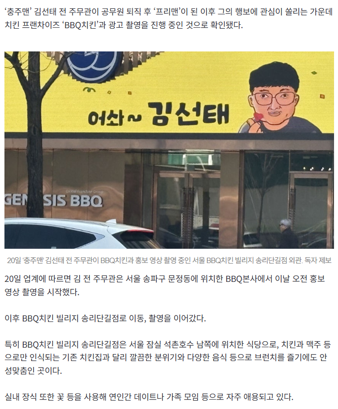 [여시뉴스데스크][단독] ‘충주맨’ 김선태, 두 번째 파트너로 BBQ?…“BBQ치킨과 대중 친화 브랜드 홍보” 작성자REVERXE|작성시간26.03.20|조회수9,221 목록 댓글 14 글자크기 작게가 글자크기 크게가 출처: https://n.news.naver.com/mnews/article/022/0004114406?sid=101[단독] ‘충주맨’ 김선태, 두 번째 파트너로 BBQ?…“BBQ치킨과 대중 친화 브랜드 홍보”‘충주맨’ 김선태 전 주무관이 공무원 퇴직 후 ‘프리맨’이 된 이후 그의 행보에 관심이 쏠리는 가운데 치킨 프랜차이즈 ‘BBQ치킨’과 광고 촬영을 진행 중인 것으로 확인됐다. 20일 ‘충주맨n.news.naver.com 다음검색 현재 게시글 추가 기능 열기 북마크 공유하기 신고 센터로 신고 댓글 댓글 14 댓글쓰기 답글쓰기 댓글 리스트 작성자우유나라 | 작성시간 26.03.20 ㅋㅋㅋ아니김선태랑콜라보하면치킨을더먹을거같나?? 처넌이라도깎는게낫지 작성자오리는꽥꽦 | 작성시간 26.03.20 비비큐가 기부해라 작성자sokply | 작성시간 26.03.20 우은은 아이유를 써놓고 김선태를? 작성자치와와왈 | 작성시간 26.03.20 와 진짜 잘나가네 작성자탱그르릉 | 작성시간 26.03.20 히않타 진심 댓글 전체보기