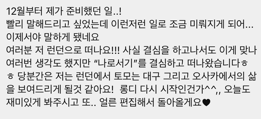 - 코로나 끝나고 토모와 너무 오랜기간 붙어있다보니 '나 혼자 뭘 제대로 해낼수있는 사람인가?' 라는 생각이 들었고, 혼자 잘 살았던 내 자신을 잊은 느낌이기도 하고, 너무 내가 편한대로만 살고있는거같아서 어학연수를 결심