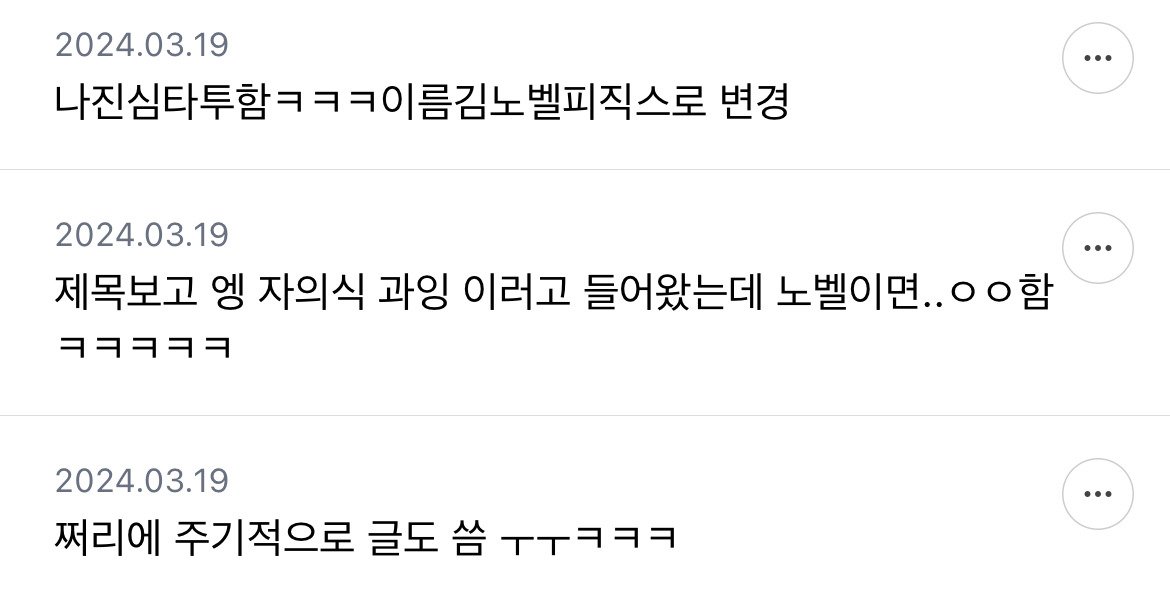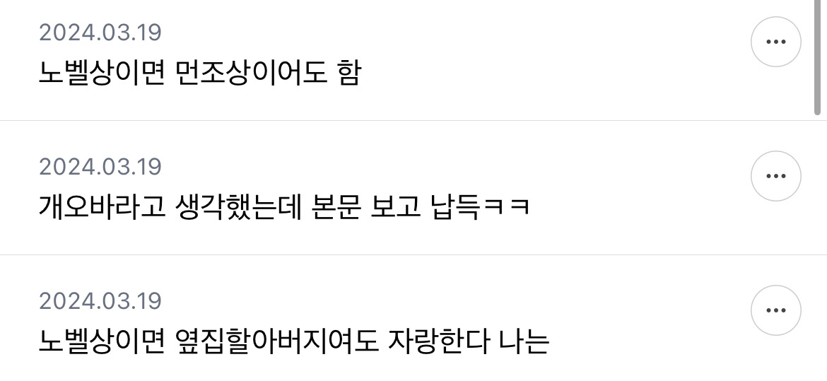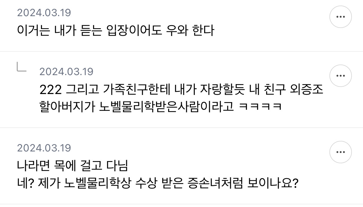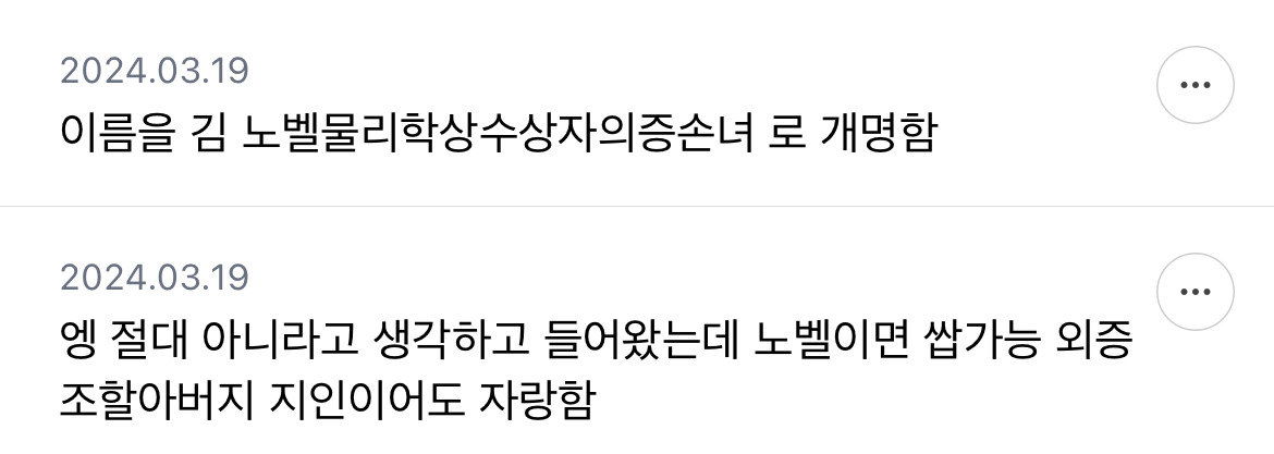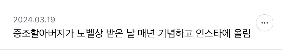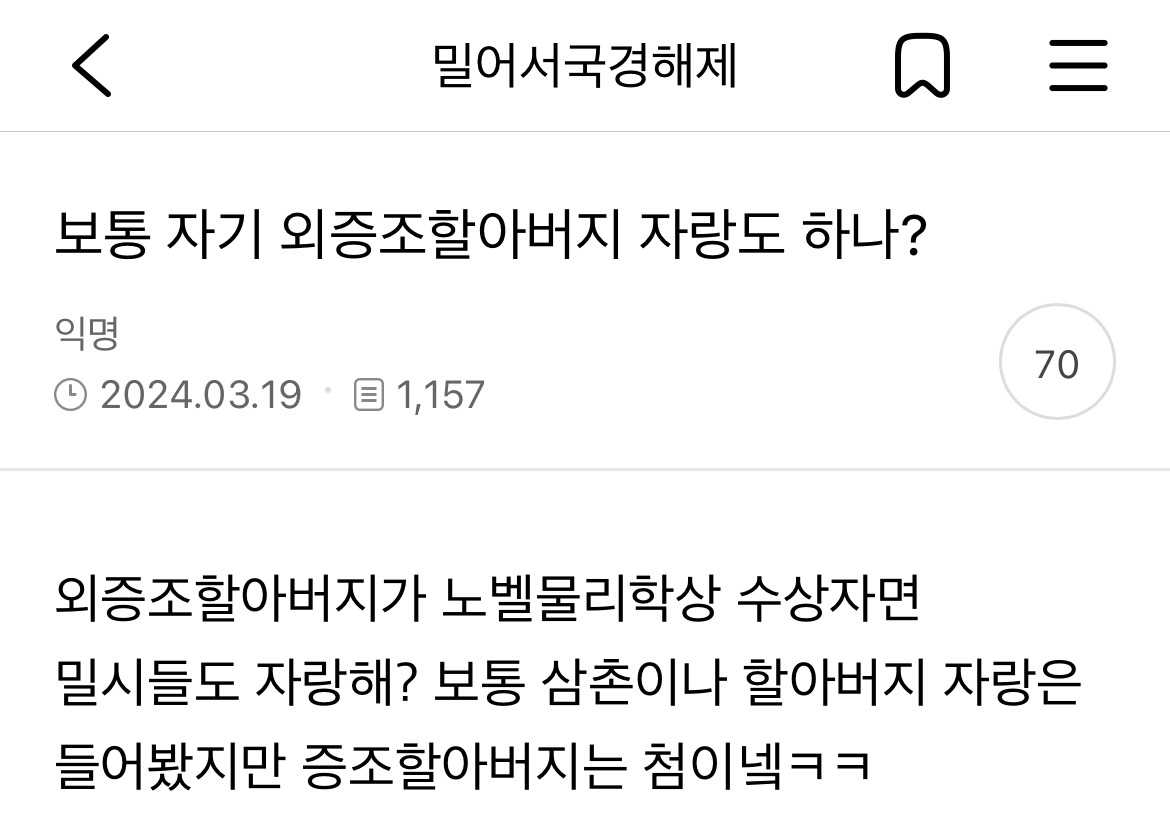 [흥미돋]보통 자기 외증조할아버지 자랑도 하나? 작성자호박나무|작성시간26.03.20|조회수92,671 목록 댓글 347 글자크기 작게가 글자크기 크게가 출처: https://m.cafe.daum.net/subdued20club/Sg1Q/2470994모든 이야기의 시작 - Daum 카페모든 이야기의 시작, Daum 카페m.cafe.daum.net쩌리에 매번 글 업로드 가능 다음검색 현재 게시글 추가 기능 열기 북마크 공유하기 신고 센터로 신고 댓글 댓글 347 댓글쓰기 답글쓰기 댓글 리스트 작성자Oㅣ재명 | 작성시간 26.03.22 노밸상은 할만하지; 작성자딥치즈 베이컨 포테이토 | 작성시간 26.03.23 조상이어도 자랑스러운데 내 외증조할아버지라뇨 작성자진돌히디 | 작성시간 26.03.23 조상도 아니고 바로 증조할아버지인데? 작성자말머리성운좋아 | 작성시간 26.03.24 사돈의팔촌이어도 자랑함 작성자안심심하다 | 작성시간 26.03.24 걍 동네 사람이여도 자랑함 와 우리 동네 사람 외증조할아버지가 노벨상 타셨대 댓글 전체보기