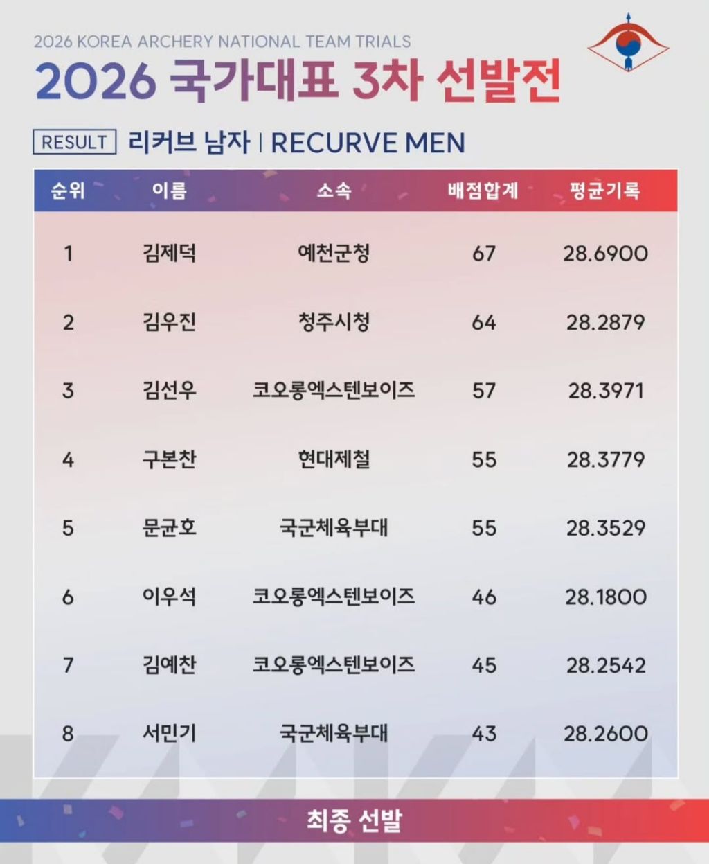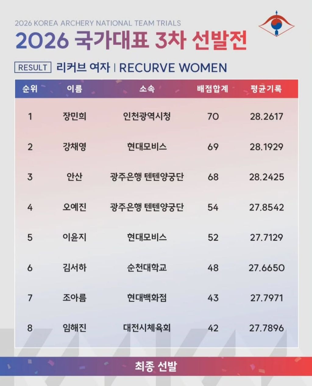 [흥미돋]2026 양궁 국가대표 3차 선발전 결과 작성자옴팡이|작성시간26.03.20|조회수42,259 목록 댓글 65 글자크기 작게가 글자크기 크게가 출처: 여성시대 옴팡이남자 리커브여자 리커브최종 8인으로 4월에 1,2차 최종 평가전 거친 후에여남 상위 3인은 올해 10월 개최 될 나고야 아시안게임 출전 예정!! 다음검색 현재 게시글 추가 기능 열기 북마크 공유하기 신고 센터로 신고 댓글 댓글 65 댓글쓰기 답글쓰기 댓글 리스트 작성자메르시 복구 | 작성시간 26.03.21 여자부 그 사람 없어서 보기 넘 편함^^ 산이 팟팅🍀 작성자후부푸푸 | 작성시간 26.03.21 산이 회이팅!!! 작성자라우윌리윌리누쿠누쿠오이오이 | 작성시간 26.03.21 미쳤다 단 1-2점 차로 순위가 바뀌네ㅎㄷ 작성자네이비위스키 | 작성시간 26.03.21 안산 최고...🫶 작성자찰옥수수밥 | 작성시간 26.03.21 오 그사람 여자부에 없네 ㅎㅎ 좋다 댓글 전체보기