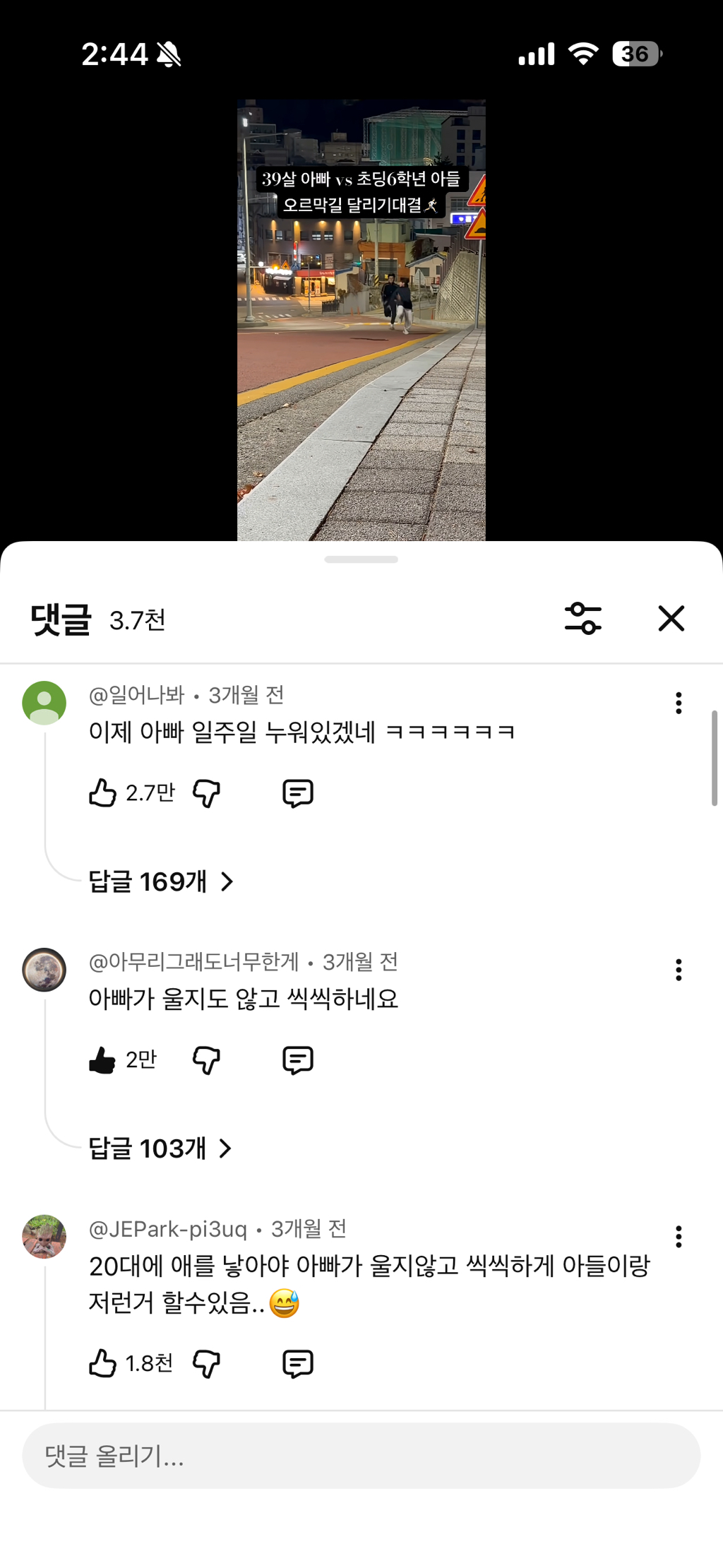 [흥미돋]39살 아빠 vs 초6 아들 달리기대결 작성자뿌치뿌치래빗|작성시간26.03.21|조회수46,150 목록 댓글 33 글자크기 작게가 글자크기 크게가 출처: https://youtube.com/shorts/9WcUHL874zU?si=EGxfUm_l41Ir_XYt젊은 아빠 부러워하는 댓이 대다수 ㄷㄷ 다음검색 현재 게시글 추가 기능 열기 북마크 공유하기 신고 센터로 신고 댓글 댓글 33 댓글쓰기 답글쓰기 댓글 리스트 작성자할수릿서 | 작성시간 26.03.21 39에 애가 6학년이면 젊다…. 작성자하늘천따지가마솥에누룽지 | 작성시간 26.03.21 그러게 아저씨 잘뛰네 ㅋㅋ 작성자쫑쫑돌쫑 | 작성시간 26.03.21 39 한국나이일텐데 애가 한국나이로 13이라고... 대박 작성자몰바십알롬앙 | 작성시간 26.03.21 대단하다,,보기만해도 숨이차요ㄷㄷㄷ 작성자언니 나 사랑하는 개가 생겼어 | 작성시간 26.03.21 여기도.뛰면서 웃고있어ㅋㅋㅋㅋㅋㅋㅋㅋㅋㅋㅋㅋㅋㅋㅋㅋㅋㅋㅋㅋㅋㅋㅋㅋㅋㅋㅋㅋㅋㅋ 댓글 전체보기
