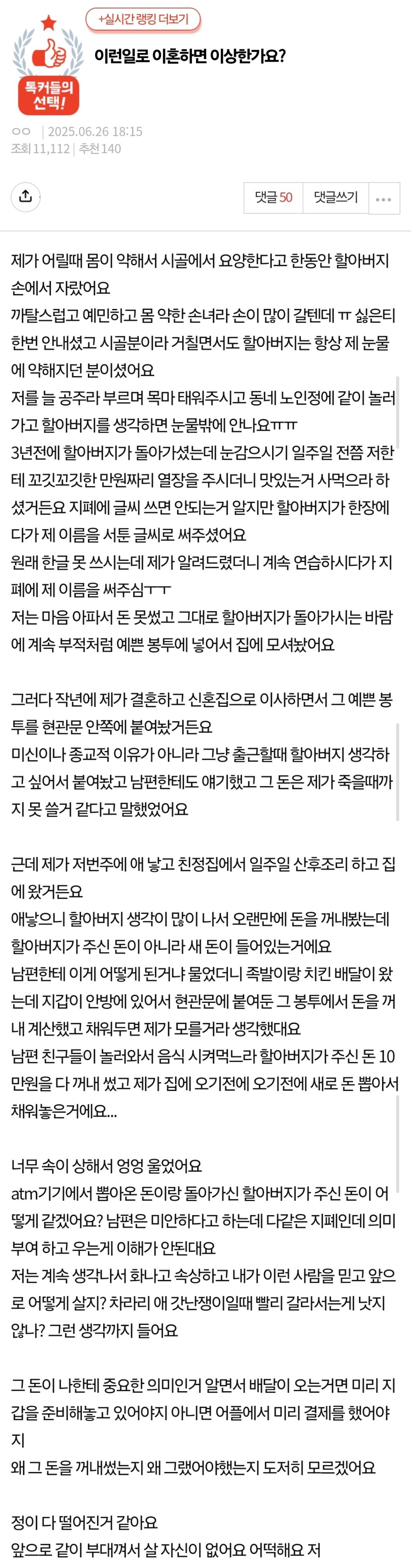 atm기기에서 뽑아온 돈이랑 돌아가신 할아버지가 주신 돈이 어떻게 같겠어요? 남편은 미안하다고 하는데 다같은 지폐인데 의미부여 하고 우는게 이해가 안된대요