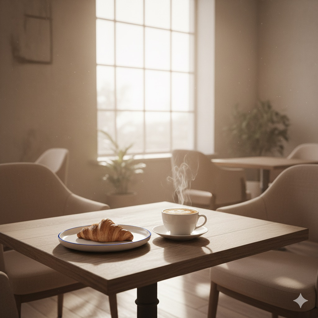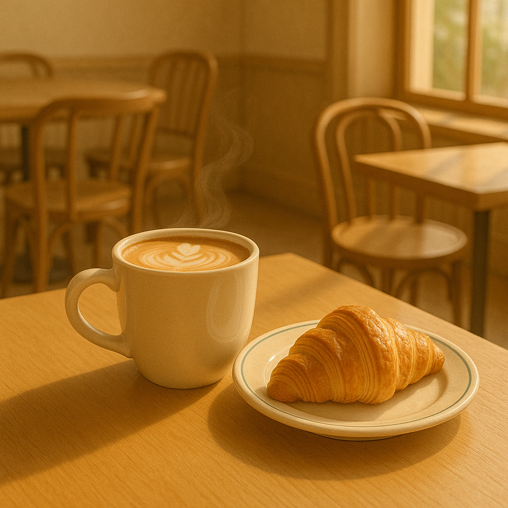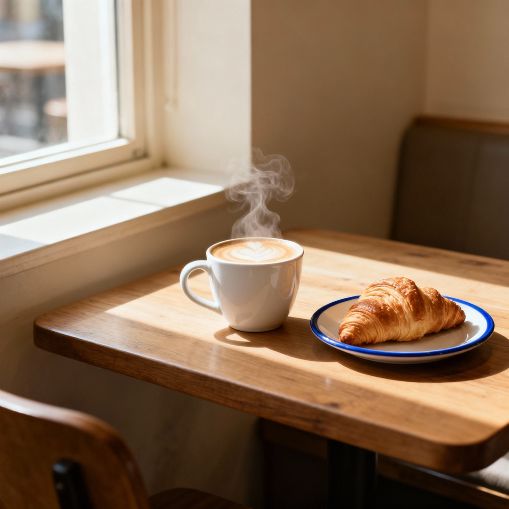 김이 나는 카페라떼 한잔과 깔끔한 접시에 크로와상 한개가 놓여있는 테이블을 그려줘