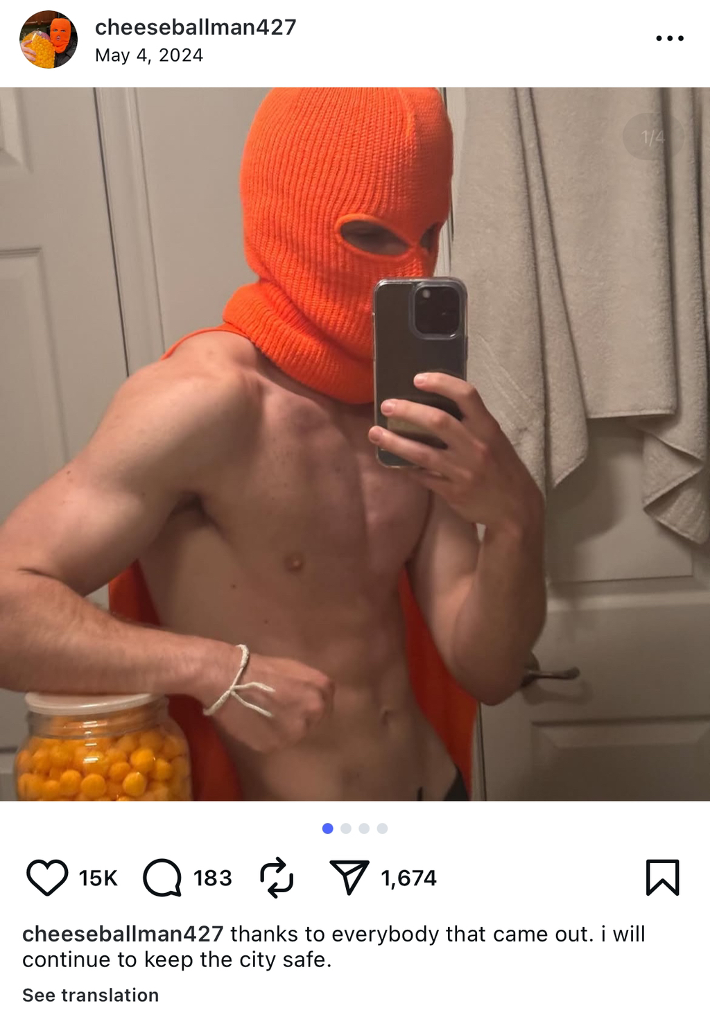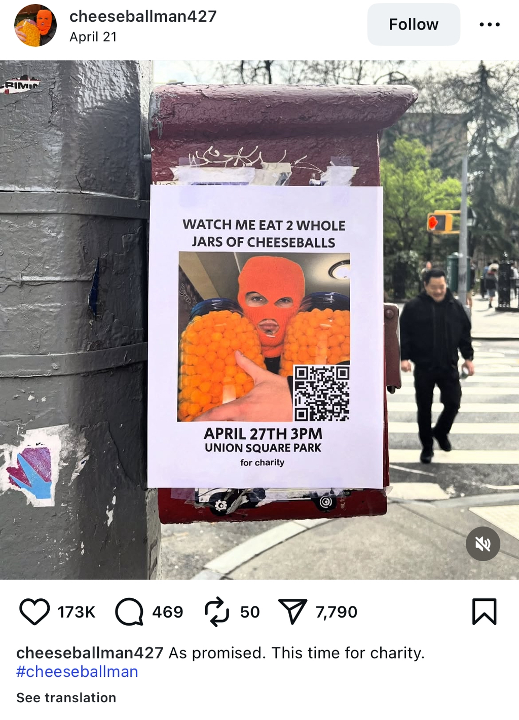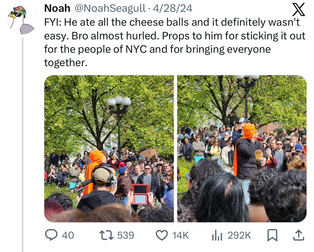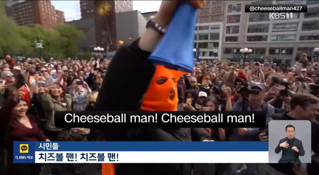 4월 27일 오후 3시에 유니온 스퀘어 파크에서 치즈볼 한 통을 비우겠다