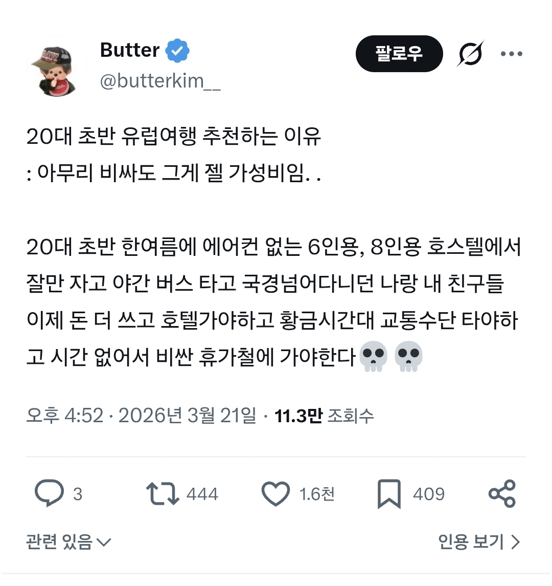 작성자탕후루헴 작성시간 26.03.22 20대 초반에 남동생 군대가기전에 같이 40일 유럽여행했는데 10년 전이긴 하지만 엄빠가 둘이 천만원 들었댔음 ㅋㅋㅋㅋ 프라하에서 25인실 호스텔에서 자고... 스위스가는 침대열차에서 베드버그 물리고... 집에서 누룽지 왕창 싸와서 그걸로 밥먹었음 ㅋㅋㅋ 지금은 나혼자 해외여행 일주일에 500은 쓰는듯...