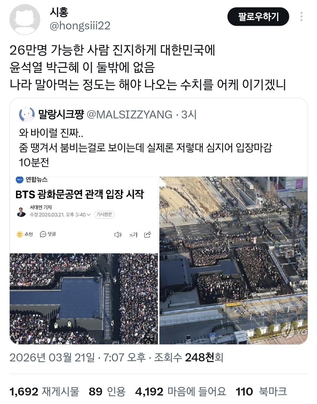 [흥미돋]26만명 가능한 사람 진지하게 대한민국에 이 둘밖에 없음.twt 작성자스피또띠아|작성시간26.03.21|조회수60,059 목록 댓글 136 글자크기 작게가 글자크기 크게가 출처: https://x.com/i/status/2035297286801199562 여성시대 스피또띠아박근혜 퇴진 시위 경찰 추산 최대 인원 43만윤석열 퇴진 시위 경찰 추산 최대 인원 24만 다음검색 현재 게시글 추가 기능 열기 북마크 공유하기 신고 센터로 신고 댓글 댓글 136 댓글쓰기 답글쓰기 댓글 리스트 작성자선샤인데이지버터멜로우 | 작성시간 26.03.22 ㅅㅂㅋㅋㅋㅋㅋㅋㅋㅋㅋㅋㅋㅋㅋㅋㅋㅋㅋㅋㅋㅋ ㅠ아니 안웃겨 작성자압둘라여시 | 작성시간 26.03.22 한마음 한뜻 작성자백수가체질잉대여 | 작성시간 26.03.23 ㅁㅊㅋㅋㅋㅋ그니까 작성자solo라잎 | 작성시간 26.03.23 ㅋㅋㅋㅋㅋㅋㅋㅋㅋㅋㅅㅂ 작성자귀뚜라미귀뚜라미 | 작성시간 26.03.23 ㄱㄴㄲ 26만이 말이 되냐고 댓글 전체보기