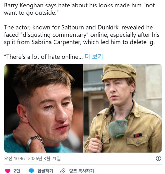 “온라인에는 혐오가 정말 많다”고 그는 말하며, 자신의 외모에 대한 “공격적인 말들”이 이어지고 있다고 밝혔다.