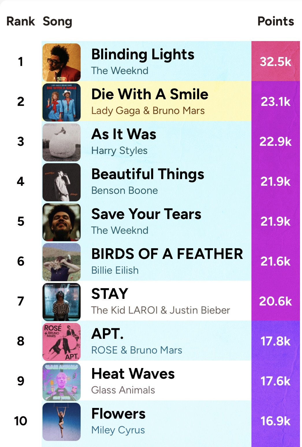 20년 이후 현재까지 전세계 스트리밍 수치와 세일즈 합산한 포인트로 순위 매긴거