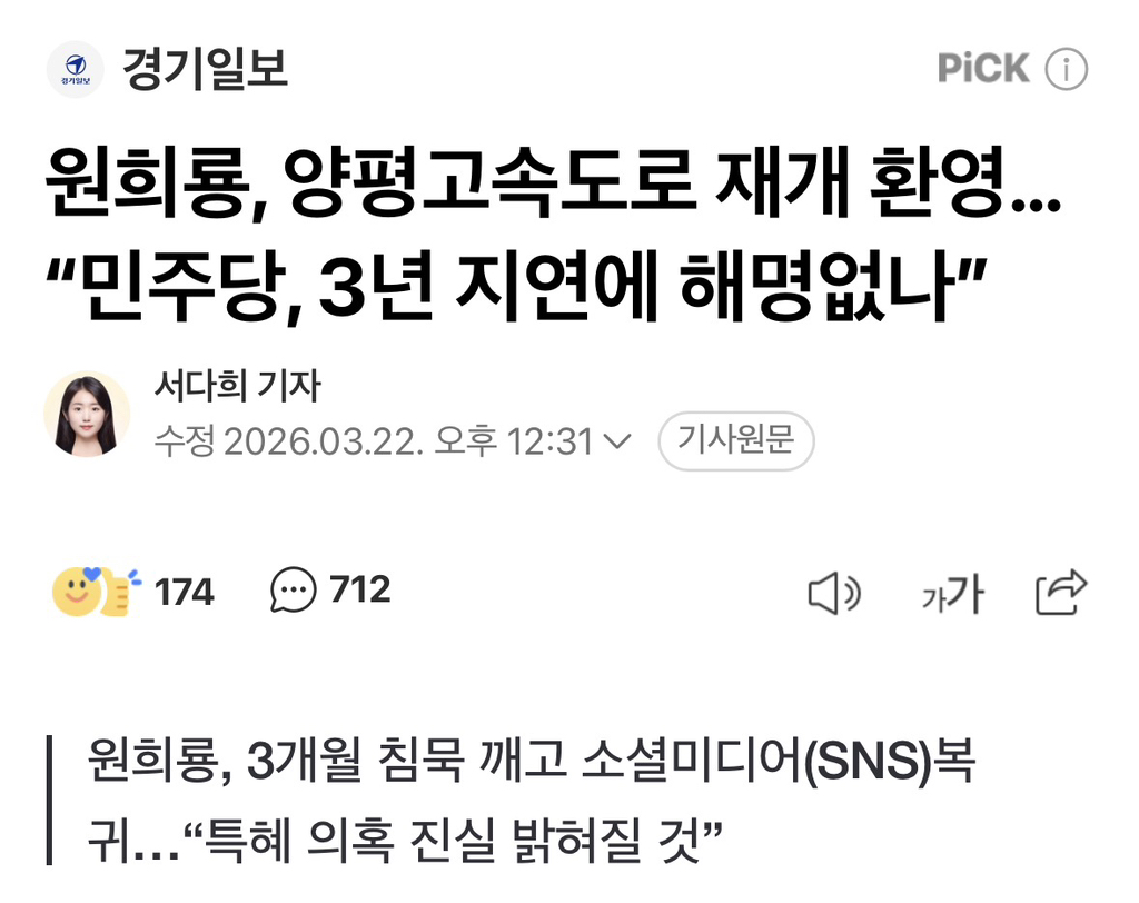 [여시뉴스데스크]원희룡, 양평고속도로 재개 환영…“민주당, 3년 지연에 해명없나” 작성자소리앙|작성시간26.03.22|조회수1,045 목록 댓글 11 글자크기 작게가 글자크기 크게가 출처: https://naver.me/5Jqi6NJb원희룡, 양평고속도로 재개 환영…“민주당, 3년 지연에 해명없나”원희룡 전 국토교통부 장관이 정부가 서울~양평고속도로 사업 재개에 나선 것에 대해 환영의 뜻을 밝히며, 지연시킨 것에 대한 해명을 촉구했다. 원 전 장관은 22일 자신의 페이스북에 “3년 가n.news.naver.com전문출처 다음검색 현재 게시글 추가 기능 열기 북마크 공유하기 신고 센터로 신고 댓글 댓글 11 댓글쓰기 답글쓰기 댓글 리스트 작성자말차두쫀볼 | 작성시간 26.03.22 ? 작성자죠광죠의 기묘한 사화 | 작성시간 26.03.22 이ㅐ끼 아직도 안뒤졌너? 작성자글안해두 | 작성시간 26.03.22 이십새끼가아직도 주둥이는달려서 할말이있나보네 작성자대원칼국수 | 작성시간 26.03.22 미친 작성자깨굴 깨굴 | 작성시간 26.03.23 엥? 댓글 전체보기