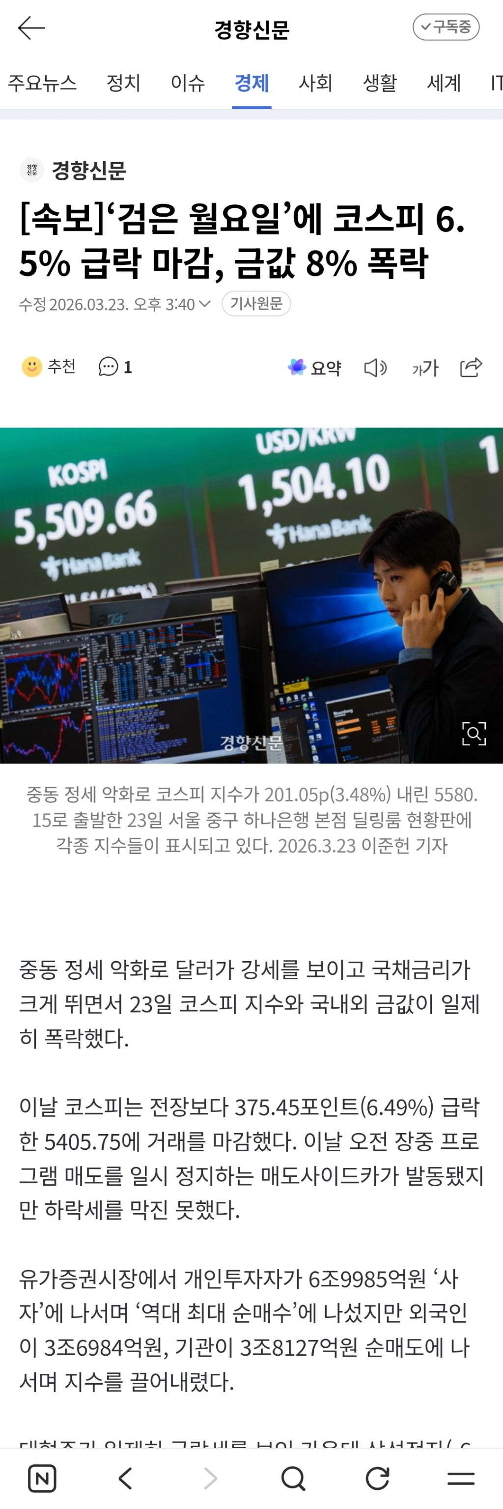 [여시뉴스데스크][속보]‘검은 월요일’에 코스피 6.5% 급락 마감, 금값 8% 폭락 작성자하리보리하|작성시간26.03.23|조회수2,758 목록 댓글 43 글자크기 작게가 글자크기 크게가 출처: https://n.news.naver.com/article/032/0003435086?sid=101[속보]‘검은 월요일’에 코스피 6.5% 급락 마감, 금값 8% 폭락중동 정세 악화로 달러가 강세를 보이고 국채금리가 크게 뛰면서 23일 코스피 지수와 국내외 금값이 일제히 폭락했다. 이날 코스피는 전장보다 375.45포인트(6.49%) 급락한 5405.75에 거래를 마감했다n.news.naver.com전문 기사참조 다음검색 현재 게시글 추가 기능 열기 북마크 공유하기 신고 센터로 신고 댓글 댓글 43 댓글쓰기 답글쓰기 댓글 리스트 작성자핑크핑크빈 | 작성시간 26.03.23 금 더 줍고 싶얶는데 돈이 없어 작성자2026 로또내놔 | 작성시간 26.03.23 살까,,,,,, ㅜ 작성자민초파베 | 작성시간 26.03.23 혹시 금 etf로 사도 ㄱㅊㄱㅊ한 거야?? 제미나이한테 물어보긴 했는데 왠지 여시들 따라서 하고 싶어ㅎㅎ 작성자E&TP | 작성시간 26.03.23 금매수갑니다〰️〰️〰️‼️‼️‼️ 작성자감각 | 작성시간 26.03.23 주웟다오늘 댓글 전체보기