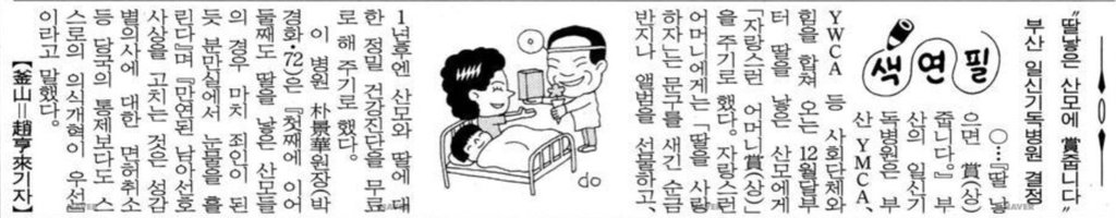 부산의 일신기독병원은 부산 YMCA, YWCA 등 사회단체와 힘을 합쳐 오는 12월달부터 딸을 낳은 산모에게 자랑스런 어머니상을 주기로 했다.