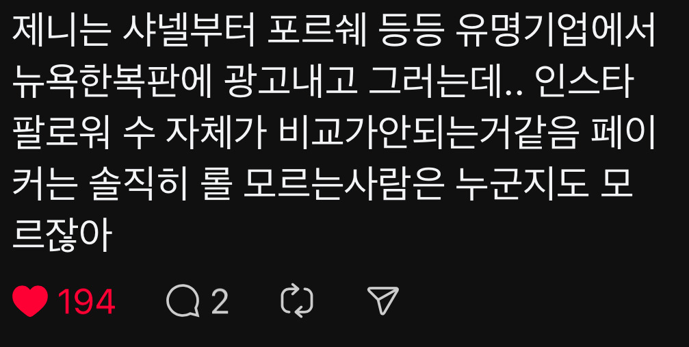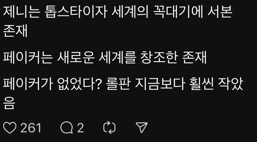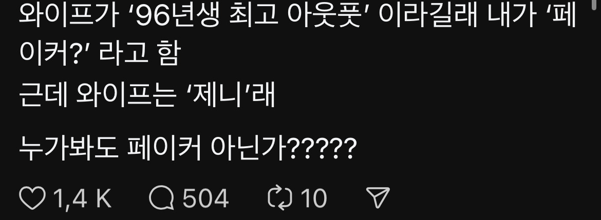 [스크랩] [기타]스레드에서 핫플난 주제 : 96년생 최고 아웃풋 작성자퐁듀|작성시간26.03.23|조회수41,518 목록 댓글 513 글자크기 작게가 글자크기 크게가 출처: 여성시대 쑥처도리사건의 발단1 제니다2 페이커다 다음검색 스크랩 원문 : *여성시대* 차분한 20대들의 알흠다운 공간 현재 게시글 추가 기능 열기 북마크 공유하기 신고 센터로 신고 댓글 댓글 513 댓글쓰기 답글쓰기 댓글 리스트 작성자초코는 존나새우편 | 작성시간 26.03.25 난 아직도 롤 게임 룰도 몰라 ㅡㅡ 작성자saturnxx | 작성시간 26.03.26 제니지 작성자나를묶고가둔다면감금죄 | 작성시간 26.03.27 고도의 페이커 안티가 아니고서야 ㅋㅋㅋ 작성자파프리카 청춘이다 | 작성시간 26.03.31 제니아녀 답댓글 작성자파프리카 청춘이다 | 작성시간 26.03.31 엄마한테 물어봣는데 제니는 아는데 페이커는 모르심제니승. 댓글 전체보기
