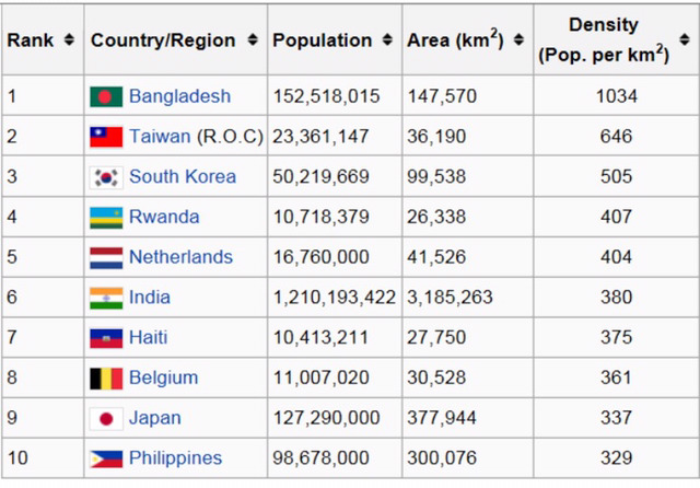(국토 면적 대비 인구 수가 많은 국가)