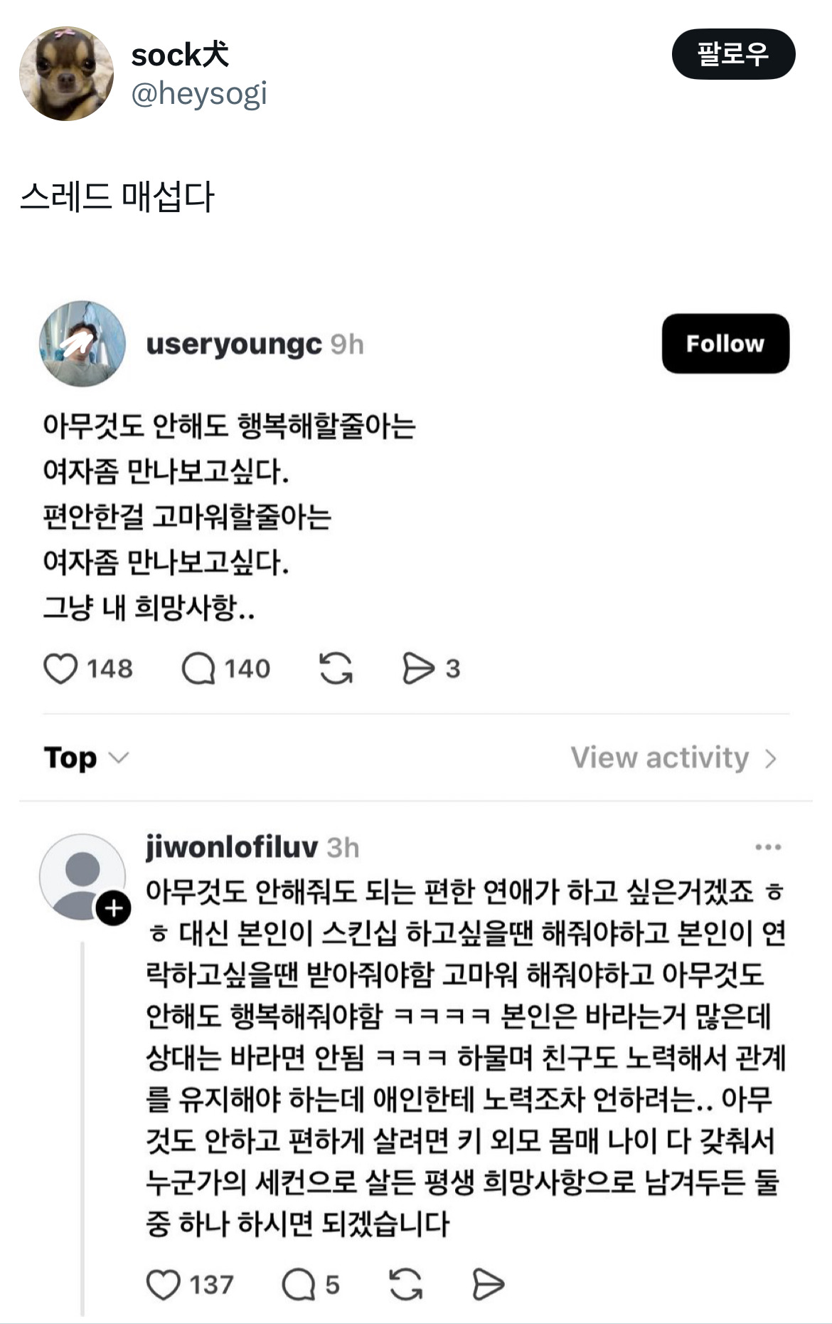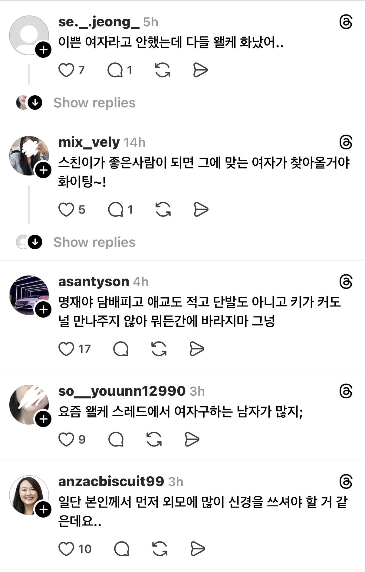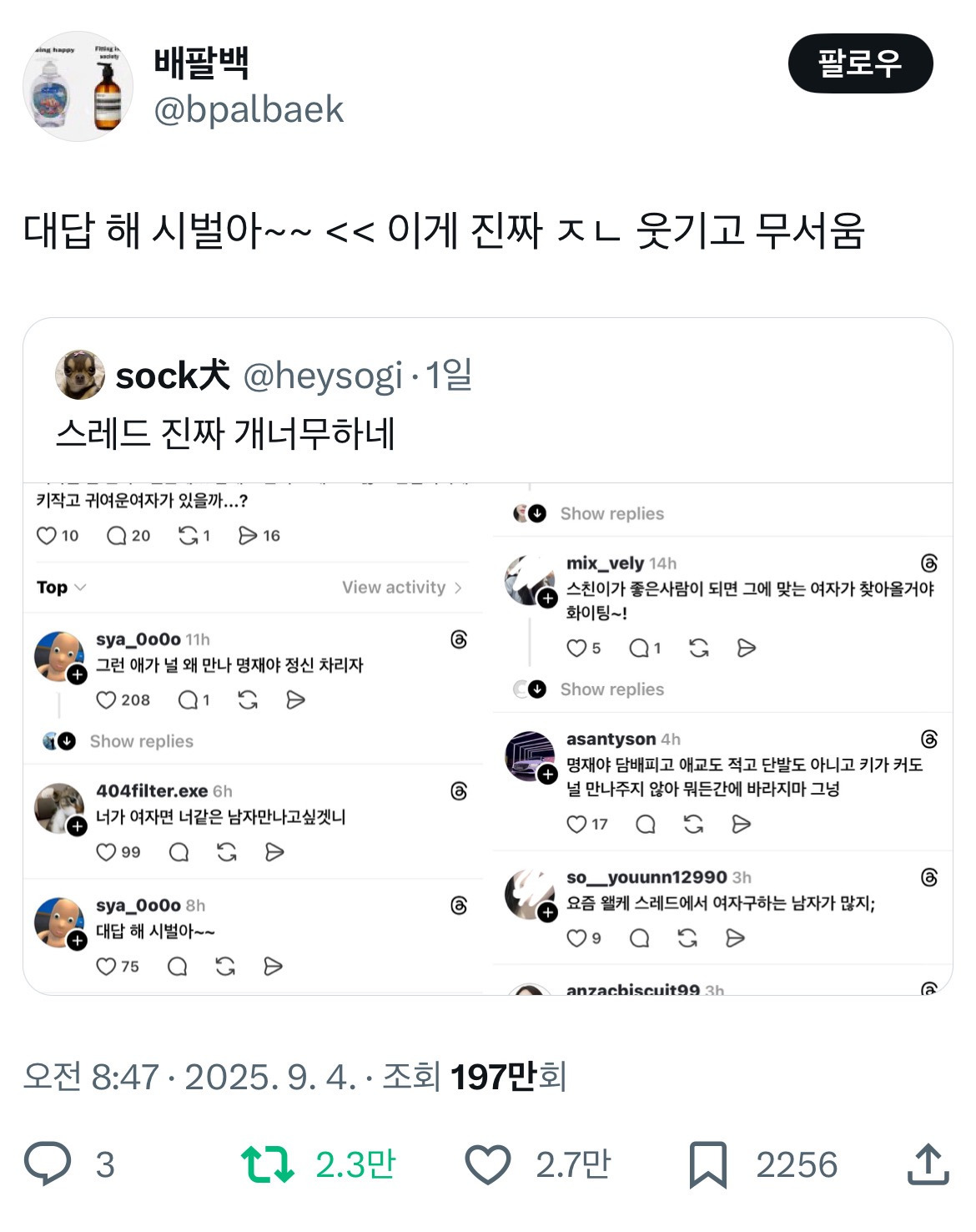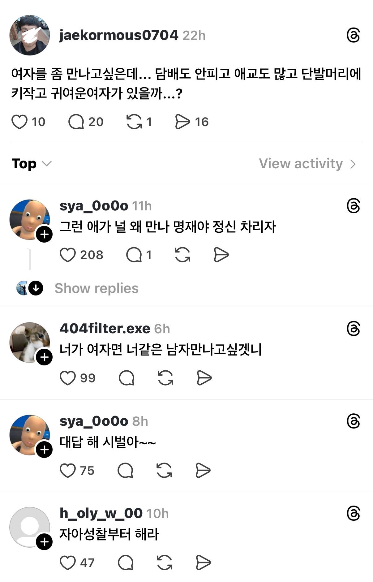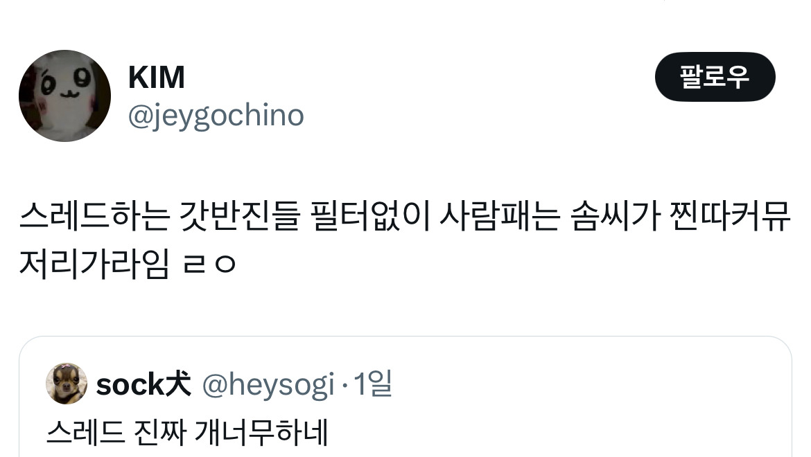 작성자왜요?저요?제가요?아진짜요? 작성시간 26.03.24 진짜 스레드에 그지같은글보이면 난 꼭 댓글봄ㅋㅋㅋㅋㅋㅋㅋㅋㅋ존나 찰지게 줘팸ㅋㅋ