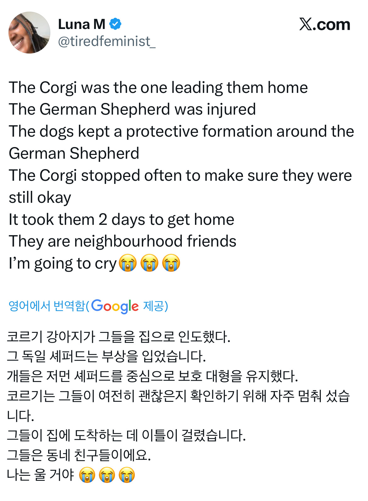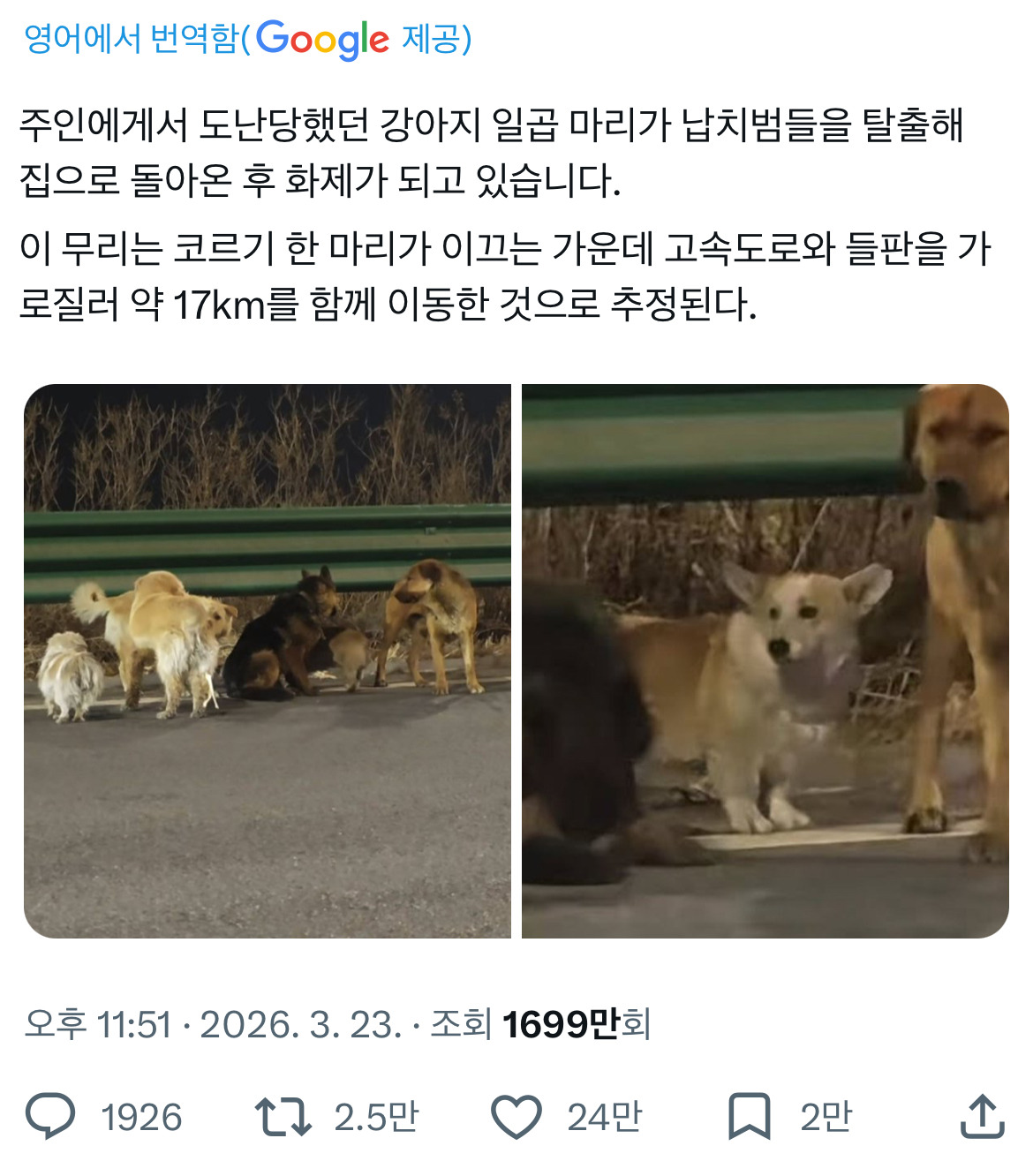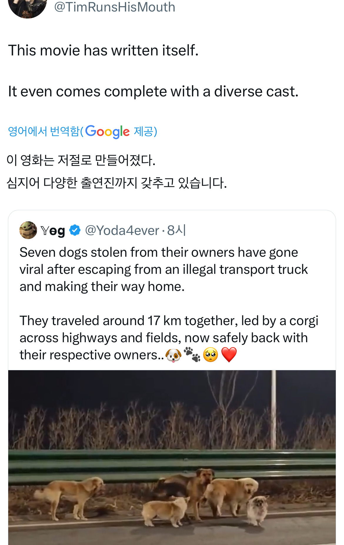 작성자또로로로르 작성시간 26.03.24 ㅜㅜ 미쳤다 진짜 저 대장 강아지도 두려웠을텐데 애들 잘 이끌고 애들도 잘 따라주고 아픈 몸으로 온전히 도움받은 애기까지 완벽하다