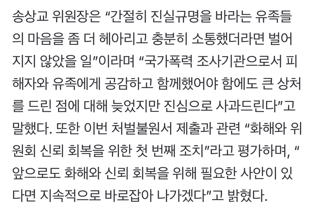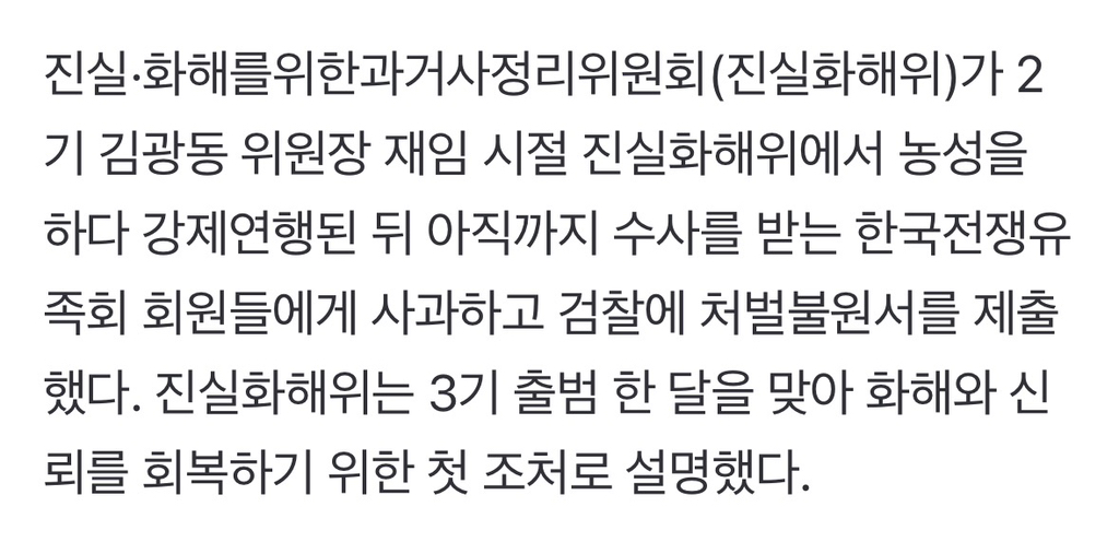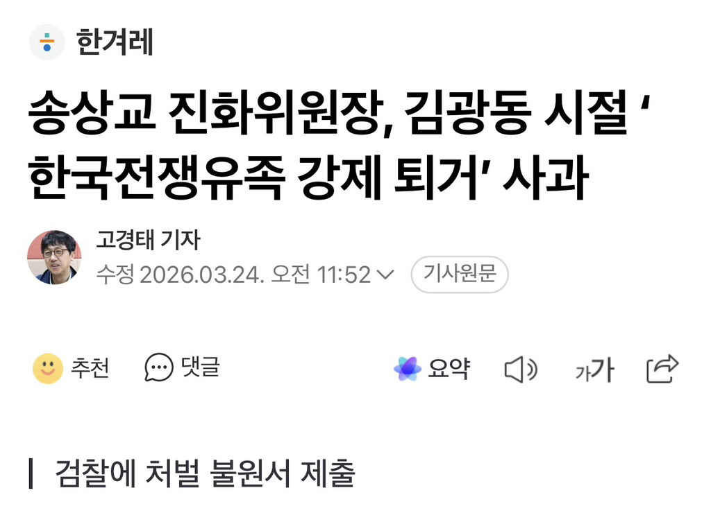 [여시뉴스데스크]송상교 진화위원장, 김광동 시절 ‘한국전쟁유족 강제 퇴거’ 사과 작성자소리앙|작성시간26.03.24|조회수400 목록 댓글 1 글자크기 작게가 글자크기 크게가 출처: https://naver.me/xXnNxNxH송상교 진화위원장, 김광동 시절 ‘한국전쟁유족 강제 퇴거’ 사과진실·화해를위한과거사정리위원회(진실화해위)가 2기 김광동 위원장 재임 시절 진실화해위에서 농성을 하다 강제연행된 뒤 아직까지 수사를 받는 한국전쟁유족회 회원들에게 사과하고 검찰에n.news.naver.com전문출처 다음검색 현재 게시글 추가 기능 열기 북마크 공유하기 신고 센터로 신고 댓글 댓글 1 댓글쓰기 답글쓰기 댓글 리스트 작성자dduug | 작성시간 26.03.24 2년이나 지나서..... 진짜 안 썩은데가 없네 댓글 전체보기