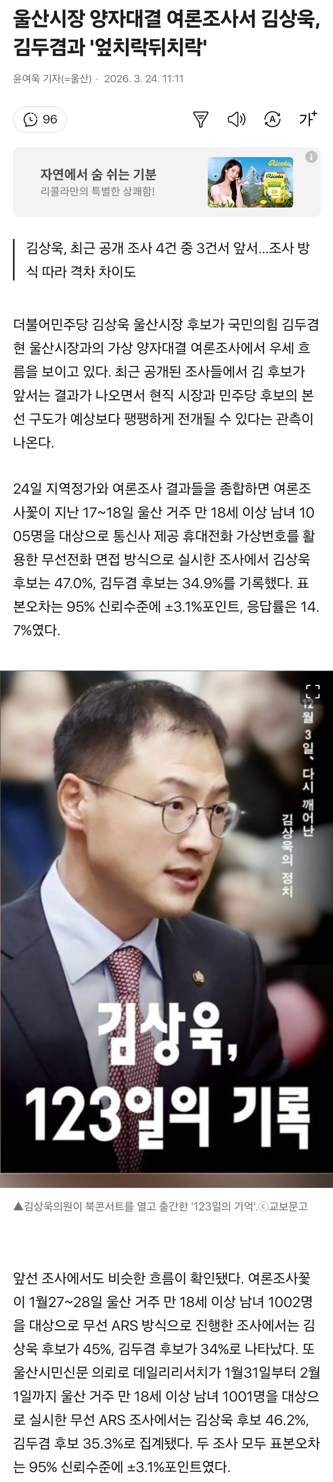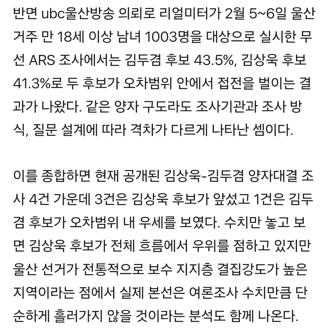 [여시뉴스데스크]울산시장 양자대결 여론조사서 김상욱, 김두겸과 '엎치락뒤치락' 작성자검동이|작성시간26.03.24|조회수1,371 목록 댓글 11 글자크기 작게가 글자크기 크게가 출처: https://v.daum.net/v/20260324111124727 ... 전문은 출처로.. 다음검색 현재 게시글 추가 기능 열기 북마크 공유하기 신고 센터로 신고 댓글 댓글 11 댓글쓰기 답글쓰기 댓글 리스트 작성자콧물흐르는 강가로 | 작성시간 26.03.24 김상욱 ㅎㅇㅌ 작성자말차두쫀볼 | 작성시간 26.03.24 ㅎㅇㅌ 작성자요르레히히 | 작성시간 26.03.24 두겸아 꺼져라 양심 없는 새끼 작성자토매이도 | 작성시간 26.03.24 김두겸은 할 만큼 하지 않았나ㅋㅋㅋ 작성자키보드소리 | 작성시간 26.03.24 젊은이가해 댓글 전체보기