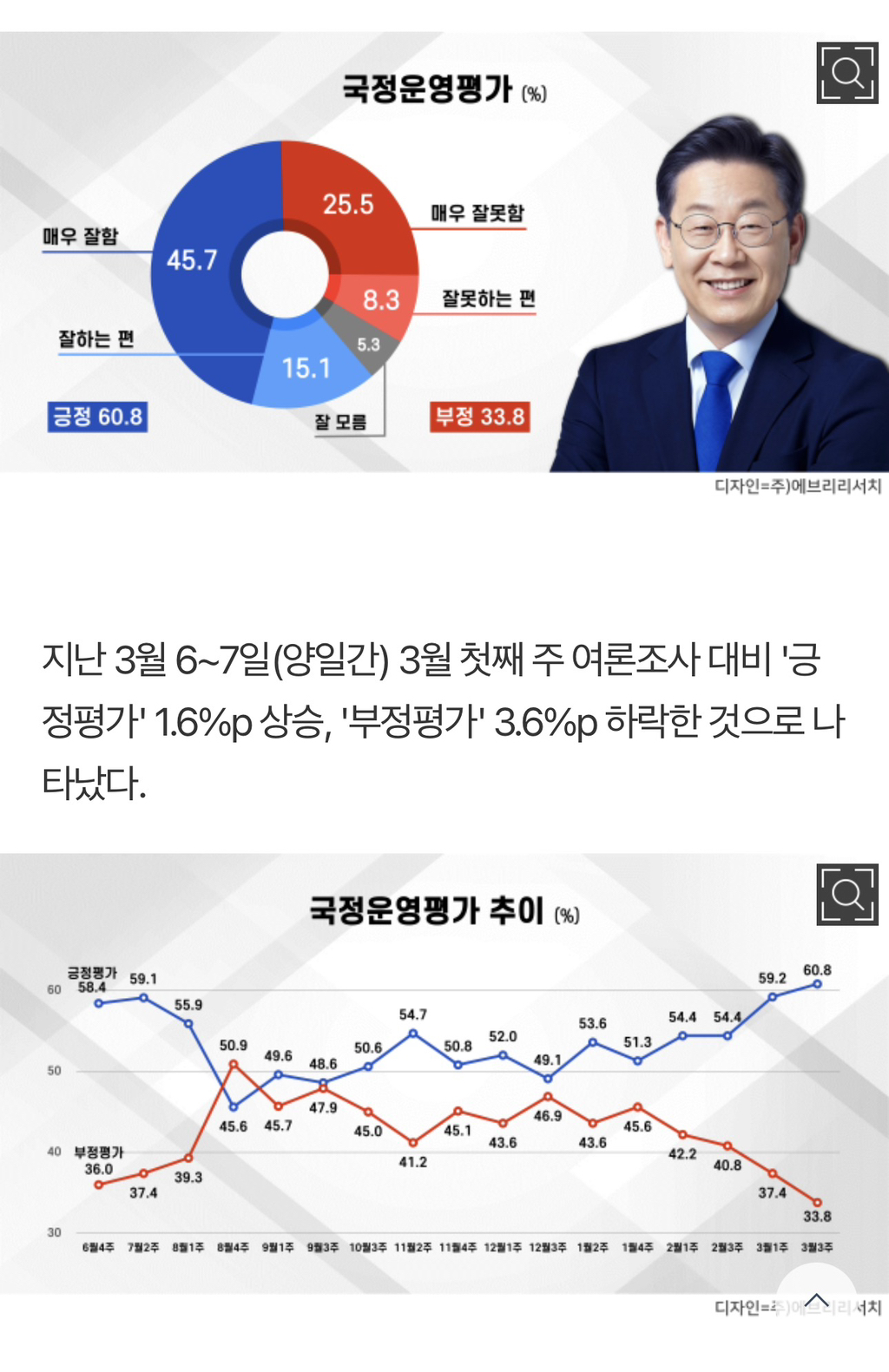 [여시뉴스데스크][에브리리서치 여론조사] 3월 셋째 주 이재명 대통령 국정운영평가, '긍정평가 60.8%' 1.6%p 상승