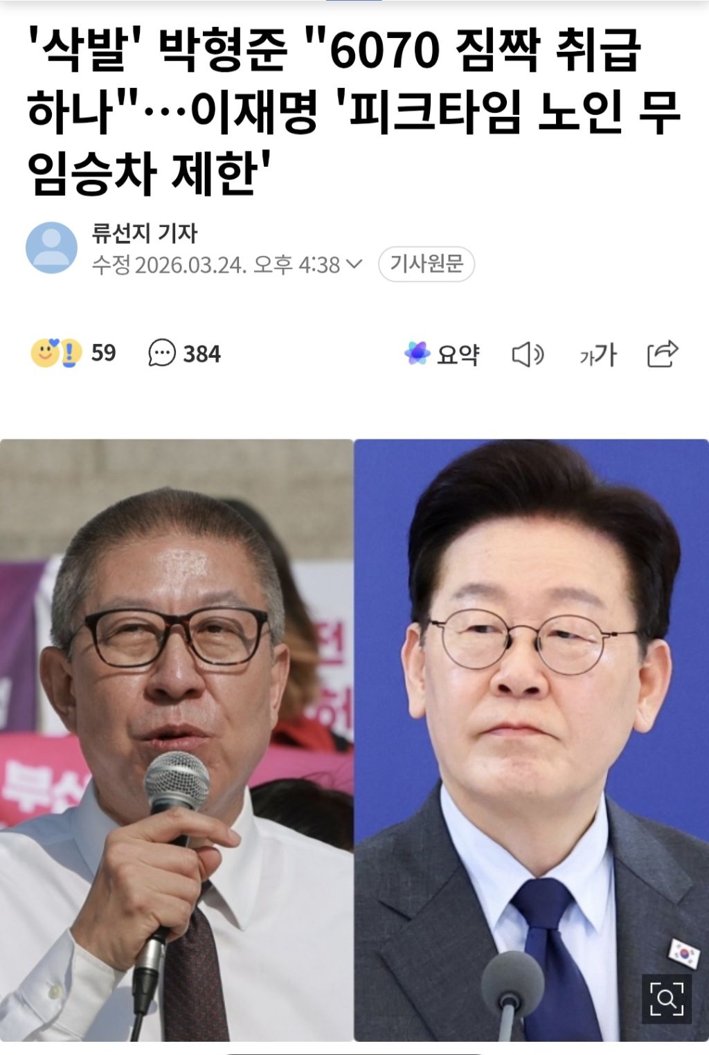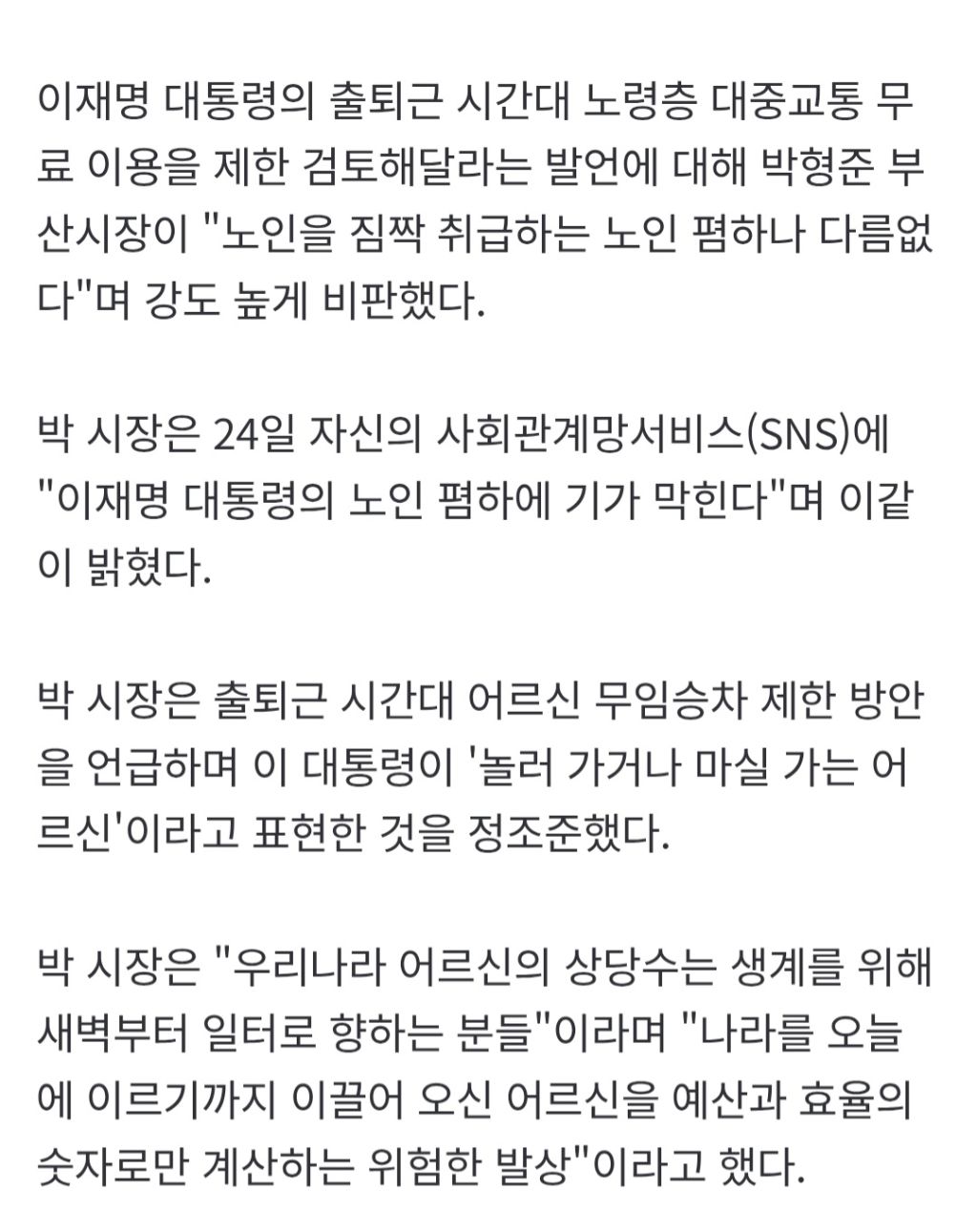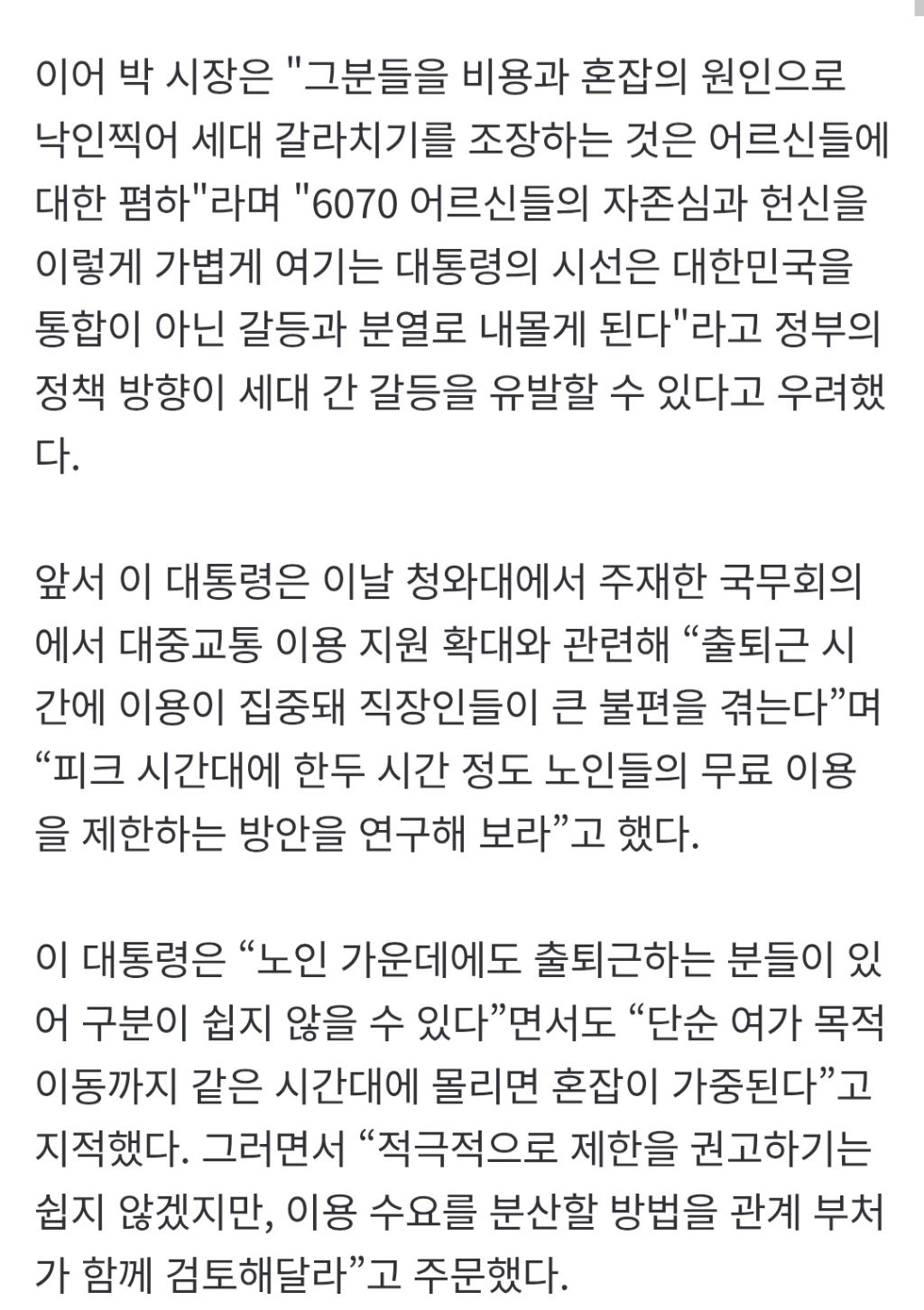 [스크랩] [여시뉴스데스크]'삭발' 박형준 "6070 짐짝 취급하나"…이재명 '피크타임 노인 무임승차 제한' 작성자정동남|작성시간26.03.24|조회수2,632 목록 댓글 15 글자크기 작게가 글자크기 크게가 출처: https://naver.me/xpjDYXAO'삭발' 박형준 "6070 짐짝 취급하나"…이재명 '피크타임 노인 무임승차 제한'이재명 대통령의 출퇴근 시간대 노령층 대중교통 무료 이용을 제한 검토해달라는 발언에 대해 박형준 부산시장이 "노인을 짐짝 취급하는 노인 폄하나 다름없다"며 강도 높게 비판했다. 박 시장n.news.naver.comㅉㅉ 다음검색 스크랩 원문 : 이종격투기 현재 게시글 추가 기능 열기 북마크 공유하기 신고 센터로 신고 댓글 댓글 15 댓글쓰기 답글쓰기 댓글 리스트 작성자한준호 | 작성시간 26.03.24 쟤 한달동안 서울에서 지하철로 출퇴근시키자; 작성자죙일누워있고싶음 | 작성시간 26.03.24 니돈으로 내세요 작성자하트발사뾰뵹 | 작성시간 26.03.24 걍 까까머리잖아 작성자허니버터맛투게더 | 작성시간 26.03.24 형주이 머리 잘어울리노 계속 해라이 작성자히히낙낙 | 작성시간 26.03.24 갈라치기는 본인이 하는 거고 내용은 어렵긴하네 출퇴근 아니더라도 그 시간에 꼭 필요한 이동이 있을 수 있는데 어떻게 제제하지 댓글 전체보기