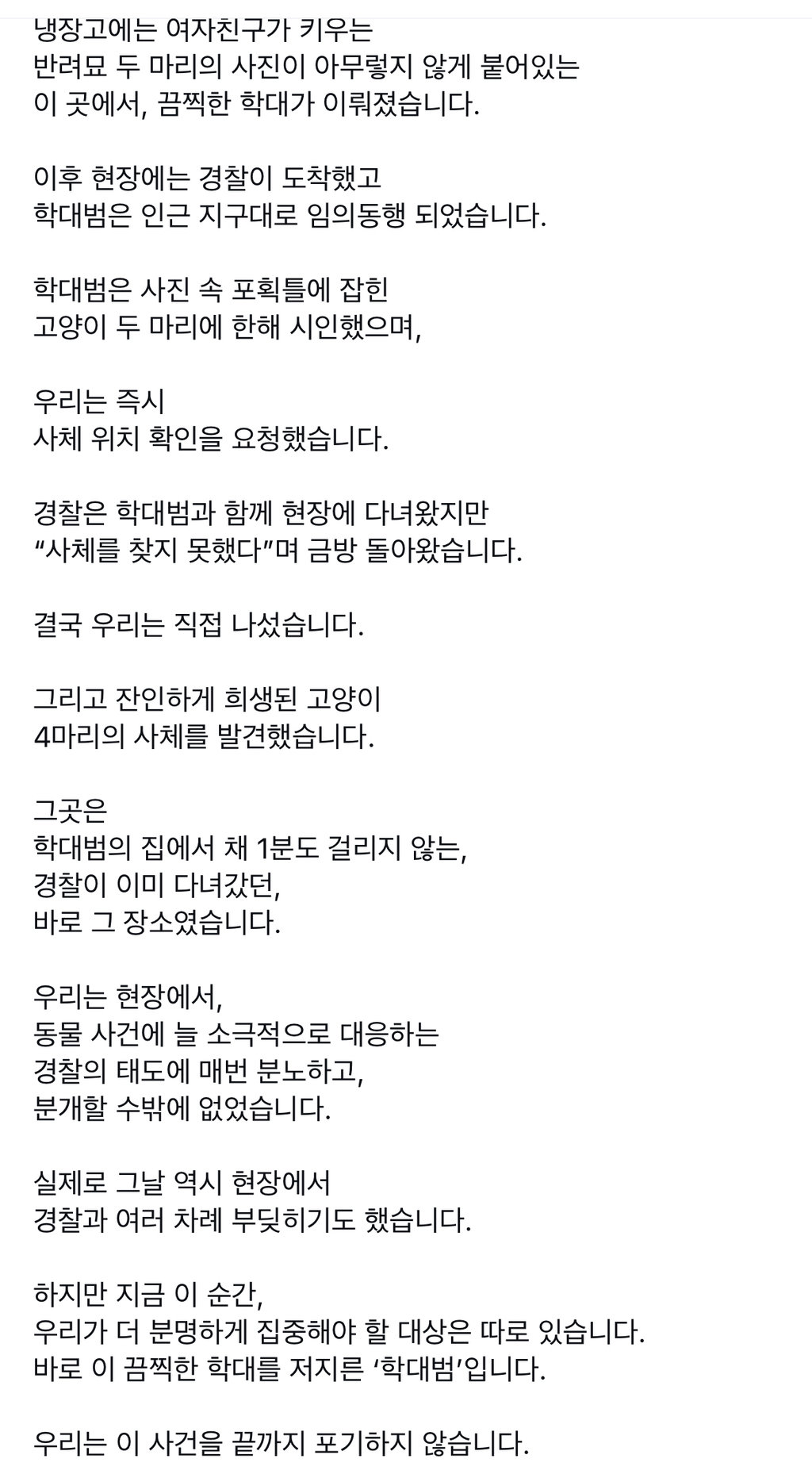 [기타]울산 동물학대범 수사 및 처벌을 위한 탄원서를 받고있습니다 작성자로또여내게로오라|작성시간26.03.24|조회수933 목록 댓글 73 글자크기 작게가 글자크기 크게가 출처: 여성시대 로또여내게로오라❗️탄원서명❗️https://docs.google.com/forms/d/e/1FAIpQLSfK6j-QNLTgWLDc8Y1BVMlYFClFd1uJmM_yodVzLGQoUkBwQg/viewform울산 고양이 학대 사건 엄중 수사 및 처벌 촉구 탄원 서명해당 탄원서 서명은 추후 경찰서에 제출될 예정입니다. [탄원서] 본인은 동물보호단체 라이프가 2026년 3월 24일 울산남부경찰서에 고발한 울산 길고양이 살해 사건 관련하여 피고발인이 수 개월docs.google.com문제시 수정 ㅠㅠ 다음검색 현재 게시글 추가 기능 열기 북마크 공유하기 신고 센터로 신고 댓글 댓글 73 댓글쓰기 답글쓰기 댓글 리스트 작성자구라치지마 | 작성시간 26.03.25 제발좀 처벌 작성자치폴레치폴레 | 작성시간 26.03.25 경찰 진짜 무능하다 작성자아캉캉 | 작성시간 26.03.25 했어 작성자r=vd 코인대박 | 작성시간 26.03.26 했다 ! 작성자쓰띵 | 작성시간 26.03.26 완 댓글 전체보기